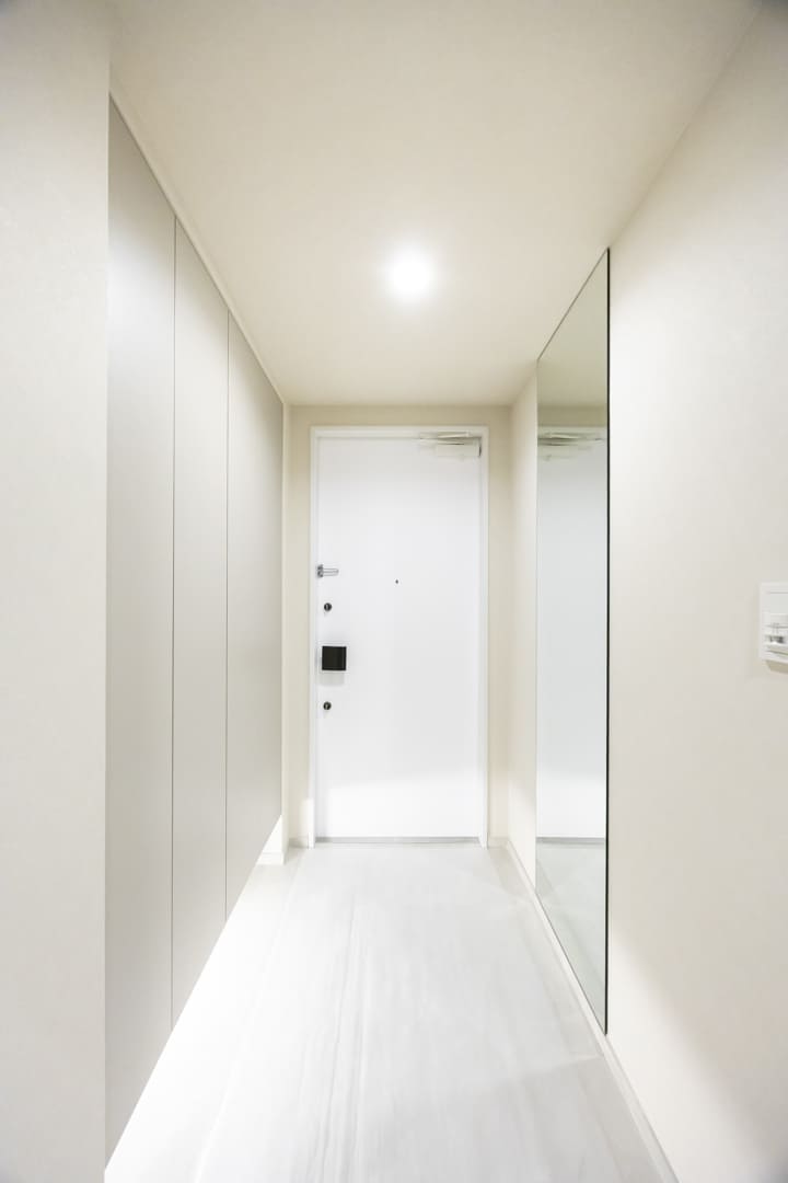 明るく清潔感のある玄関スペース。人感センサー付照明が設置されていて、夜遅く帰宅しても明るく出迎えてくれます。荷物で両手が塞がっている時や夜遅く帰宅した時に、スイッチを探す手間がかからず助かりますね。大容量のシューズボックスを備え、収納力◎。散らかりがちな靴をすっきり収納できます。対面側には全身鏡があり、靴を履いた状態でコーディネートチェックができて便利です。