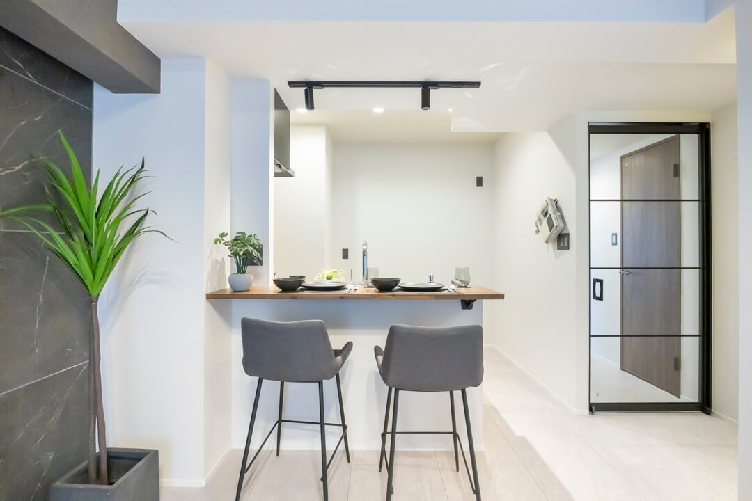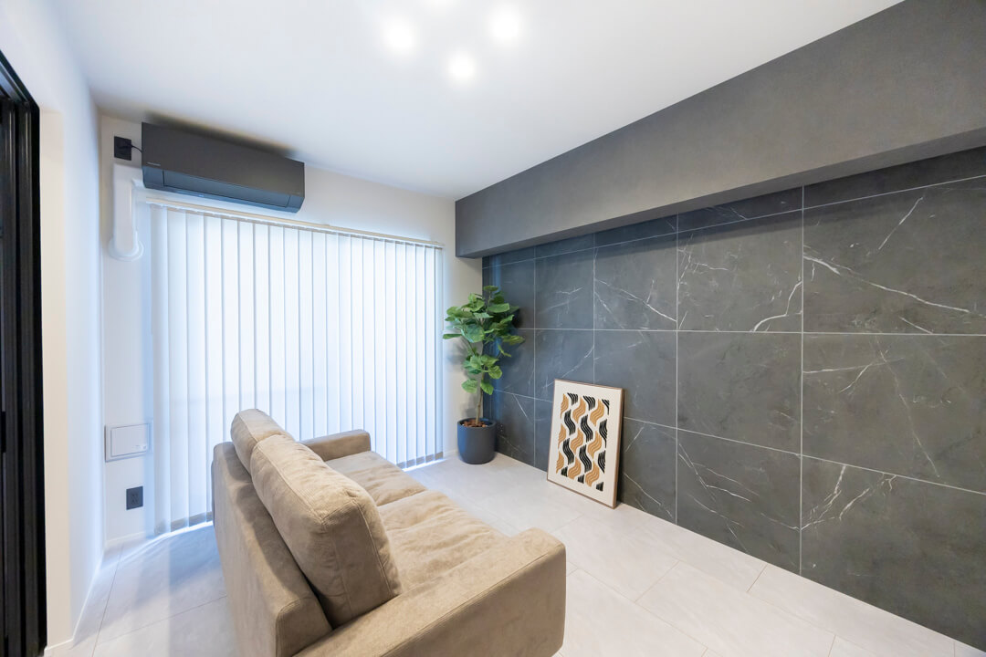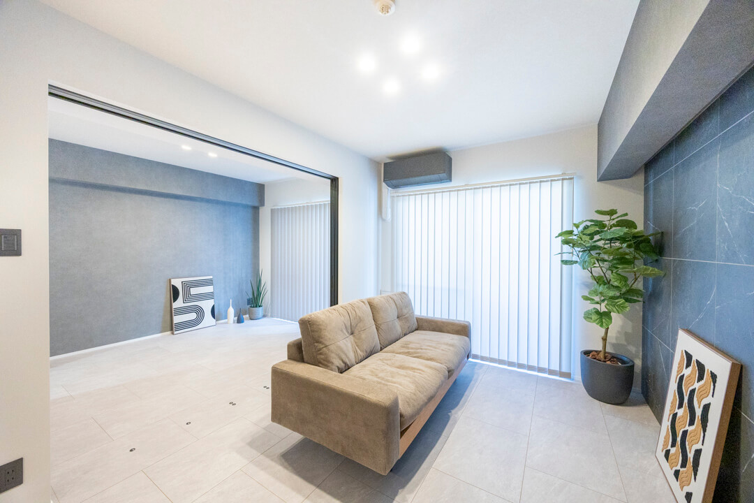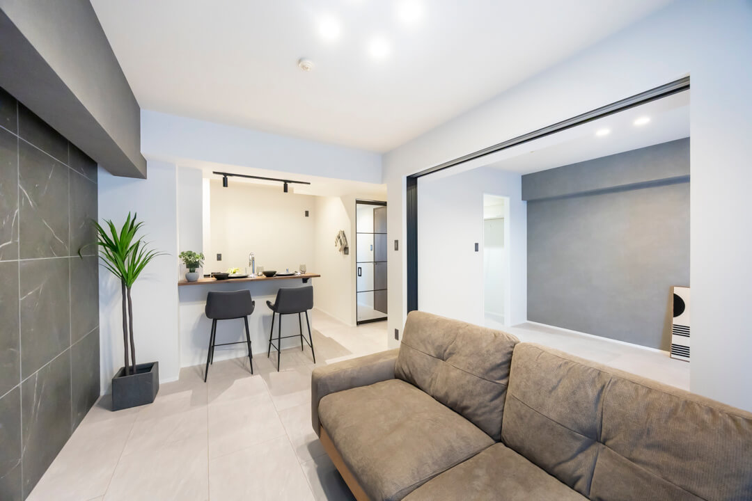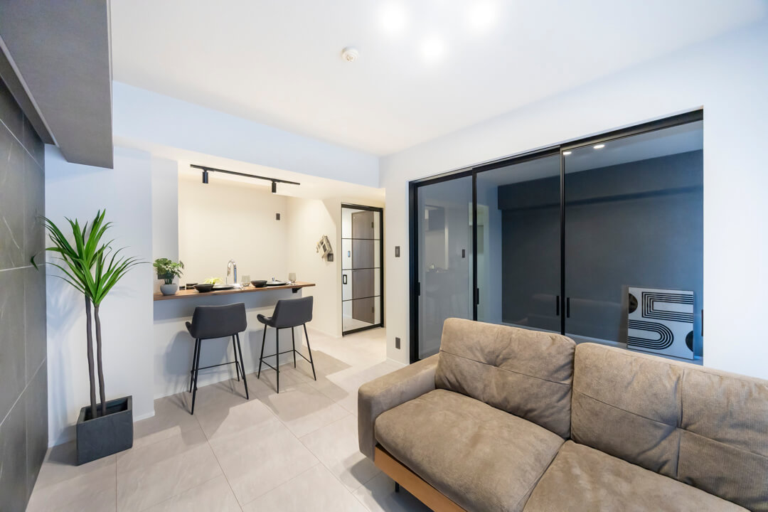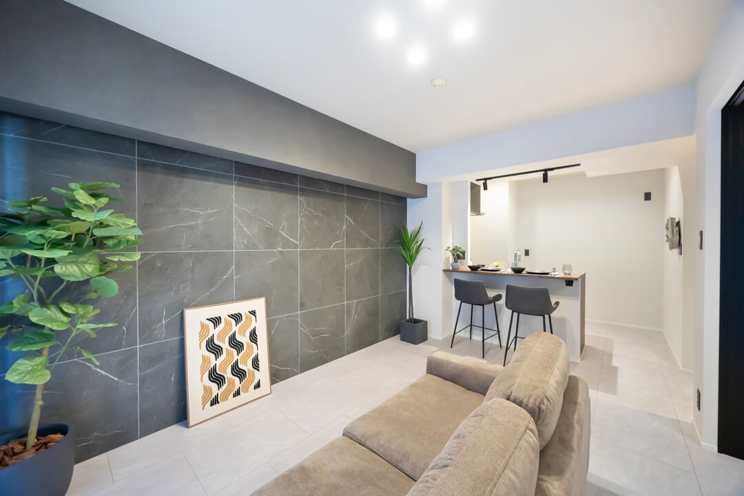 キッチンスペースを含め、約12帖のLDK。朝の光が心地よい東向きの住戸です。リビングと隣接した主寝室と繋げて広々と過ごすことが可能。仕切りの扉はブラックの半透明になっており、スタイリッシュな雰囲気が感じられます。また、石目調のアクセントウォールが施されていて、重厚感のある高級な印象も与えてくれます。