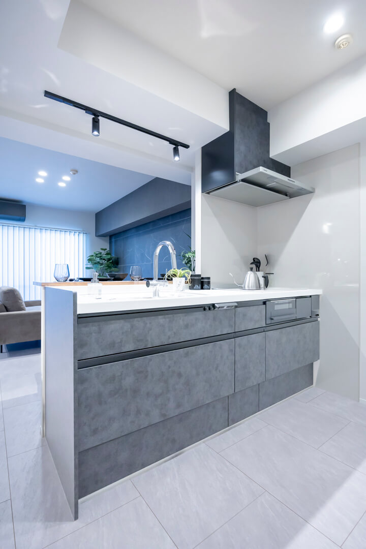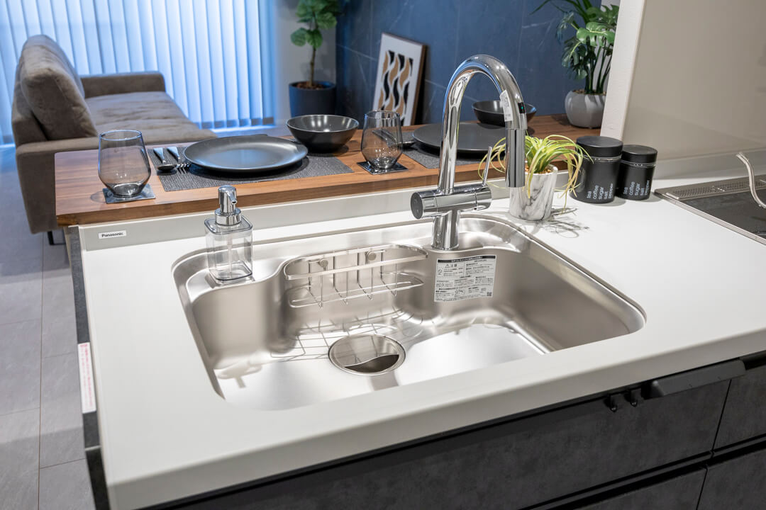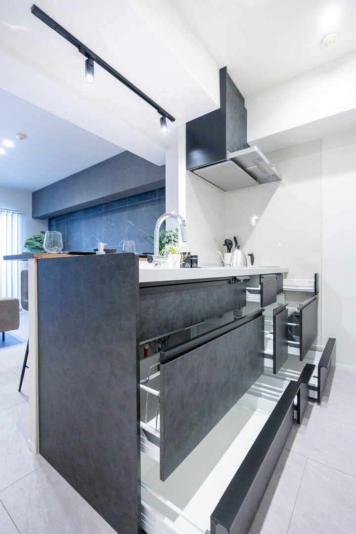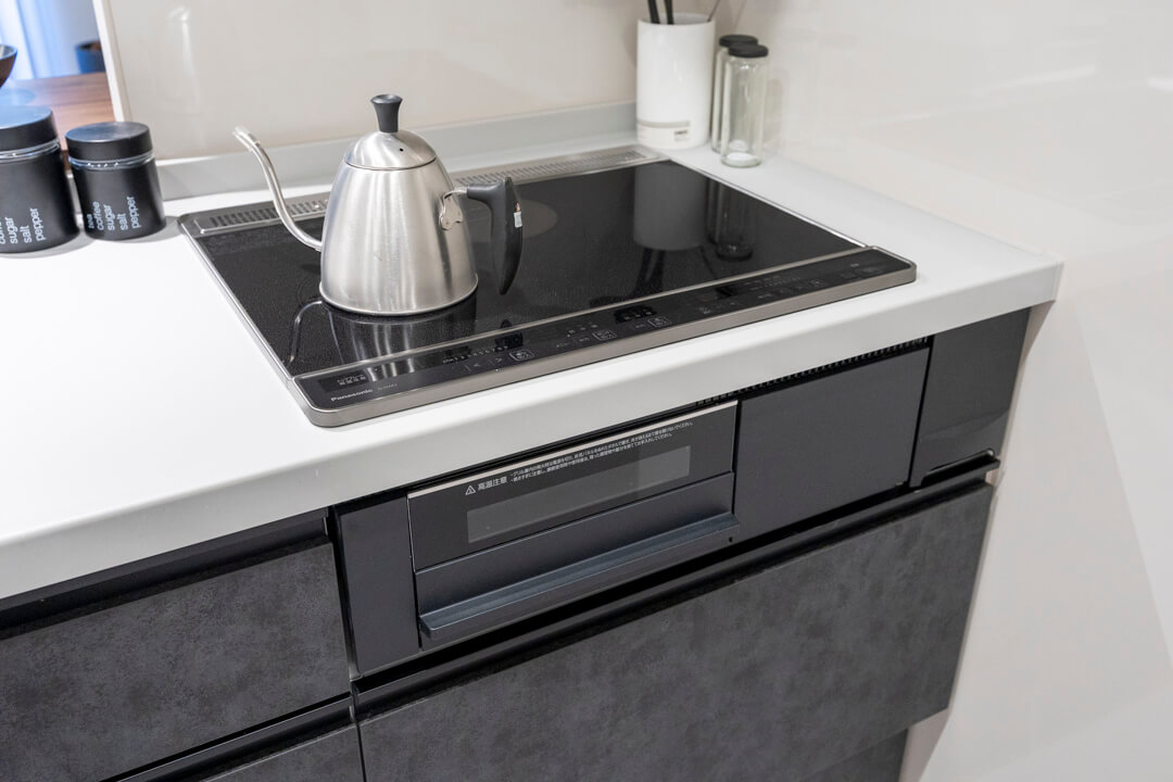 家族やゲストと会話が弾む対面型のシステムキッチン。手入れがしやすいIHクッキングヒーターです。モノの出し入れがしやすい引き出し式のキャビネットで使い勝手の良さもポイントです。