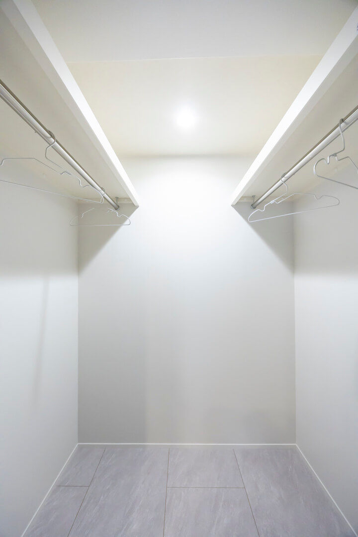 約6.0帖の主寝室。こちらも朝の光が心地よい東向きです。リビングダイニングと繋げて開放的に過ごせます。WIC(ウォークインクローゼット)は両サイドにハンガーパイプが設置されていて、洋服がたっぷり収納できます。