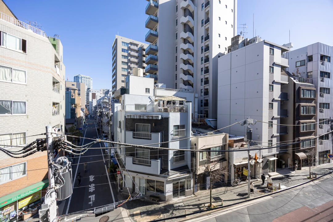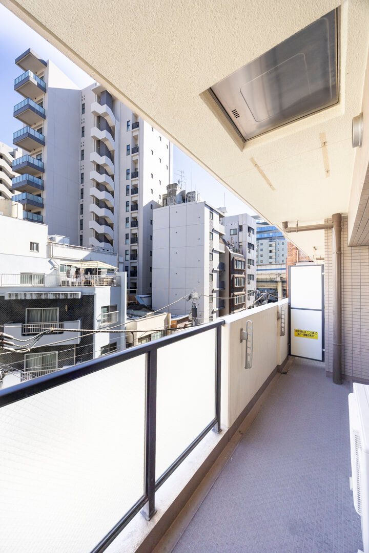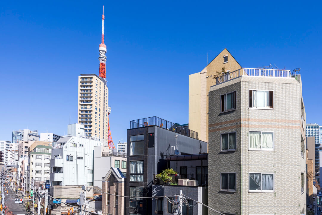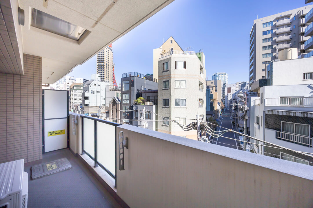 リビングダイニングと主寝室に面したバルコニー。約8.91㎡の広さで、朝の光が心地よい東向き。バルコニーからは、ビルの奥に東京タワーもちらりと望めます。