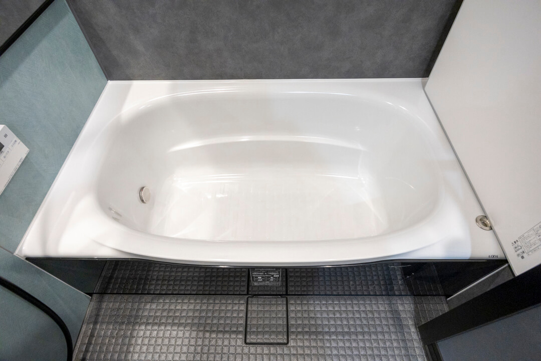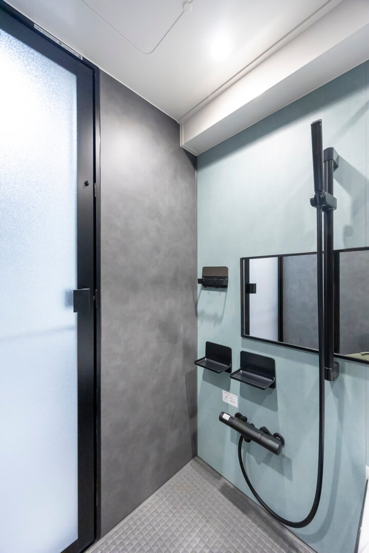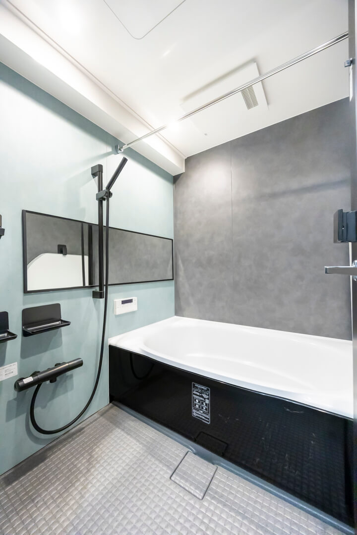 ダークトーンで統一されたスタイリッシュな雰囲気なバスルーム。追い炊き機能の他、浴室換気乾燥機とランドリーパイプ付きで雨の日や冬場の洗濯にも困りません。
