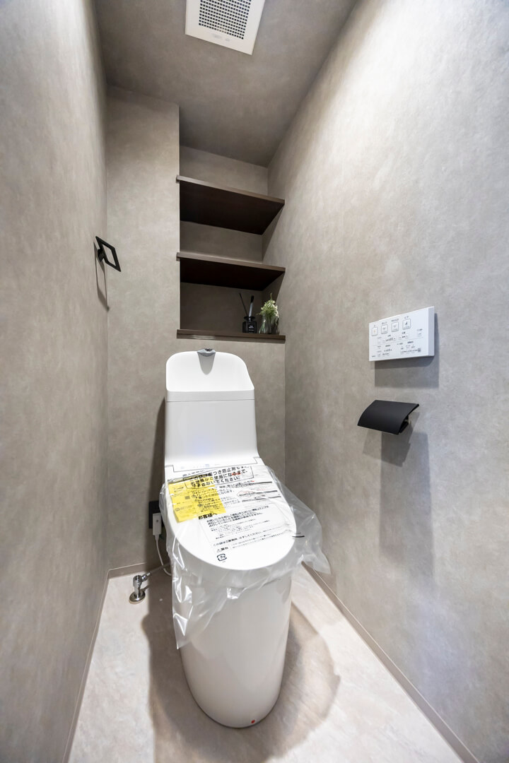 廊下に面したレストルーム。手洗いタンク付きのトイレを採用。ウォシュレット、収納棚も備わっています。