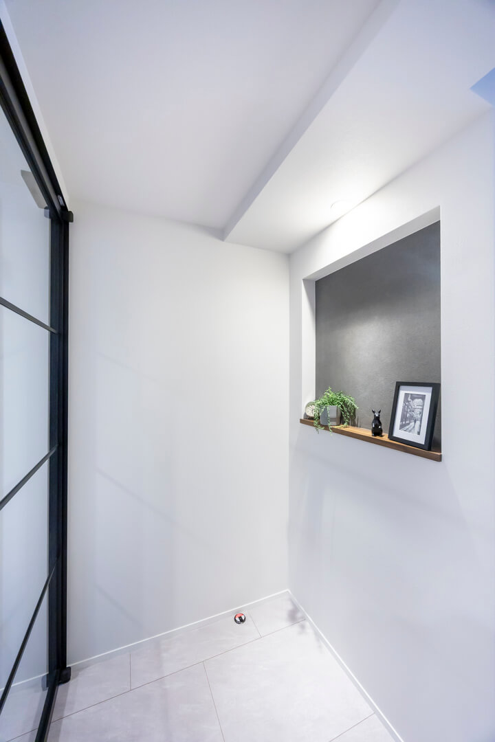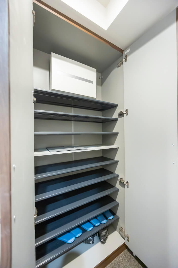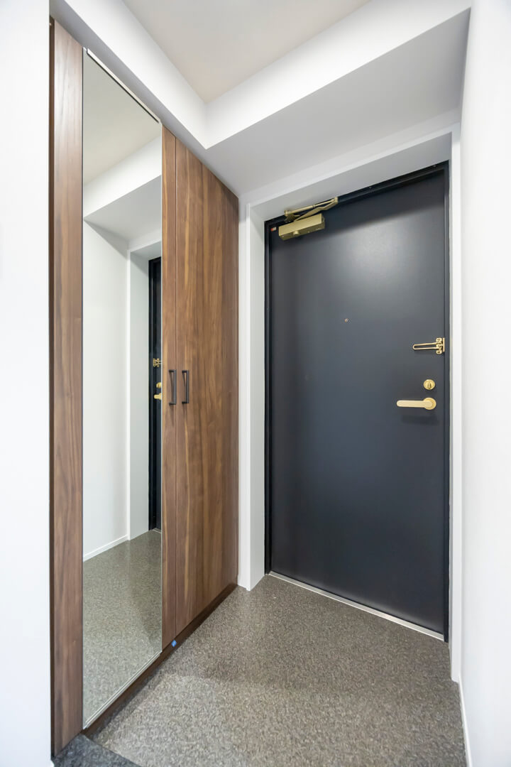 玄関にはシューズボックスを完備。扉の一面が姿見になっており、お出かけ前の身だしなみチェックができます。