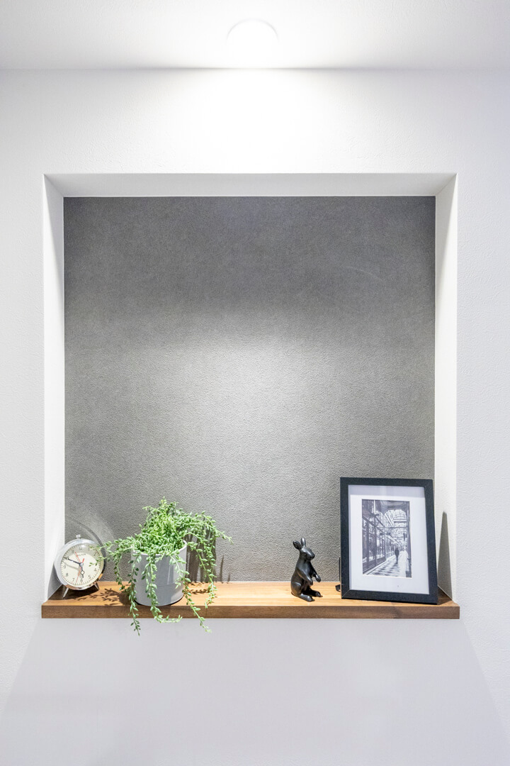 洗面室は玄関入ってすぐに位置しています。帰宅後すぐに手洗いうがいができる動線です。洗面化粧台は洗面まわりの小物がすっきり整頓できるミラーボックスや、モノの出し入れがしやすい引き出し式のキャビネット付きで使い勝手の良さもポイント。