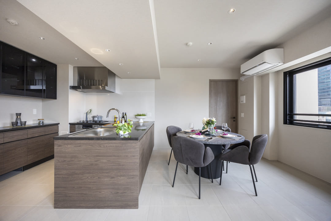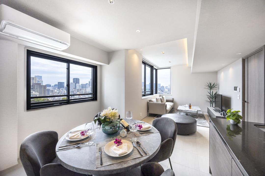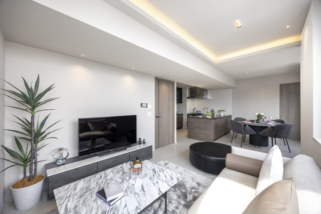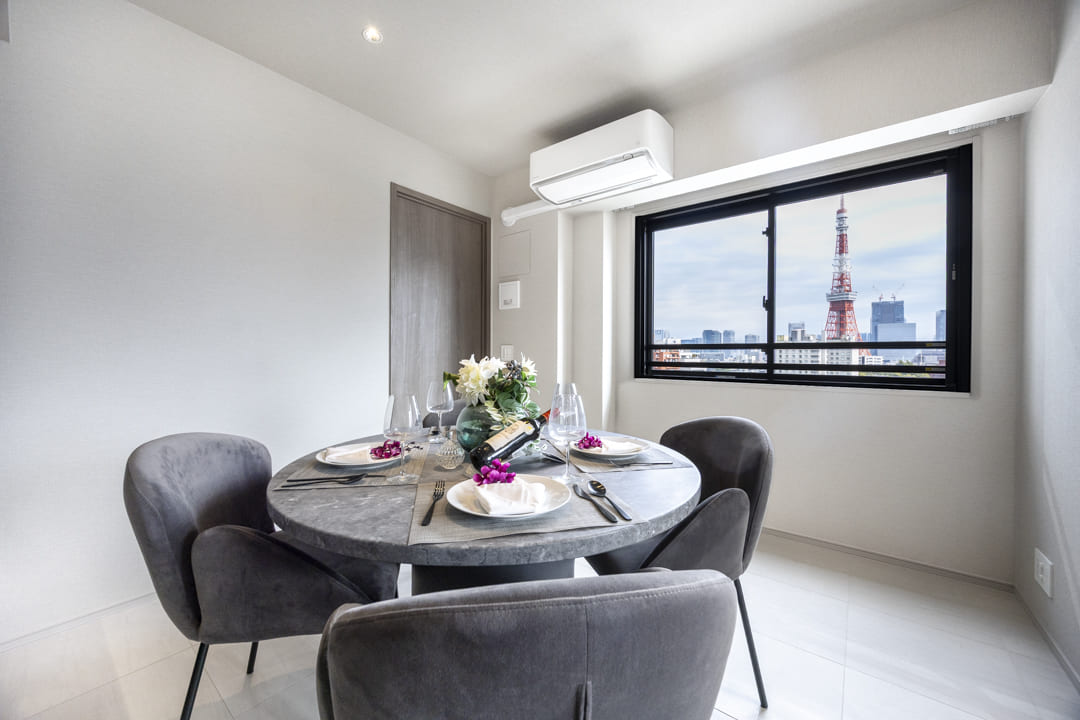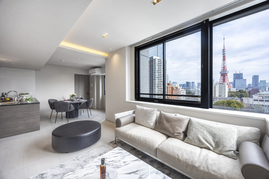 キッチンスペースを含めて約20.2帖のゆとりあるリビングダイニング。南東二面採光により、あたたかな陽光がたっぷりと差し込み、明るく開放的な空間が広がります。東側の窓からは東京タワーを望み、日中は青空に映える姿を、夜にはライトアップされた幻想的な表情をお楽しみいただけます。天井には間接照明を配し、やわらかな光が空間に奥行きと上質感を添える設計。時間帯によって表情を変える眺望とともに、都心ならではの景色を日常に取り込むことができます。
