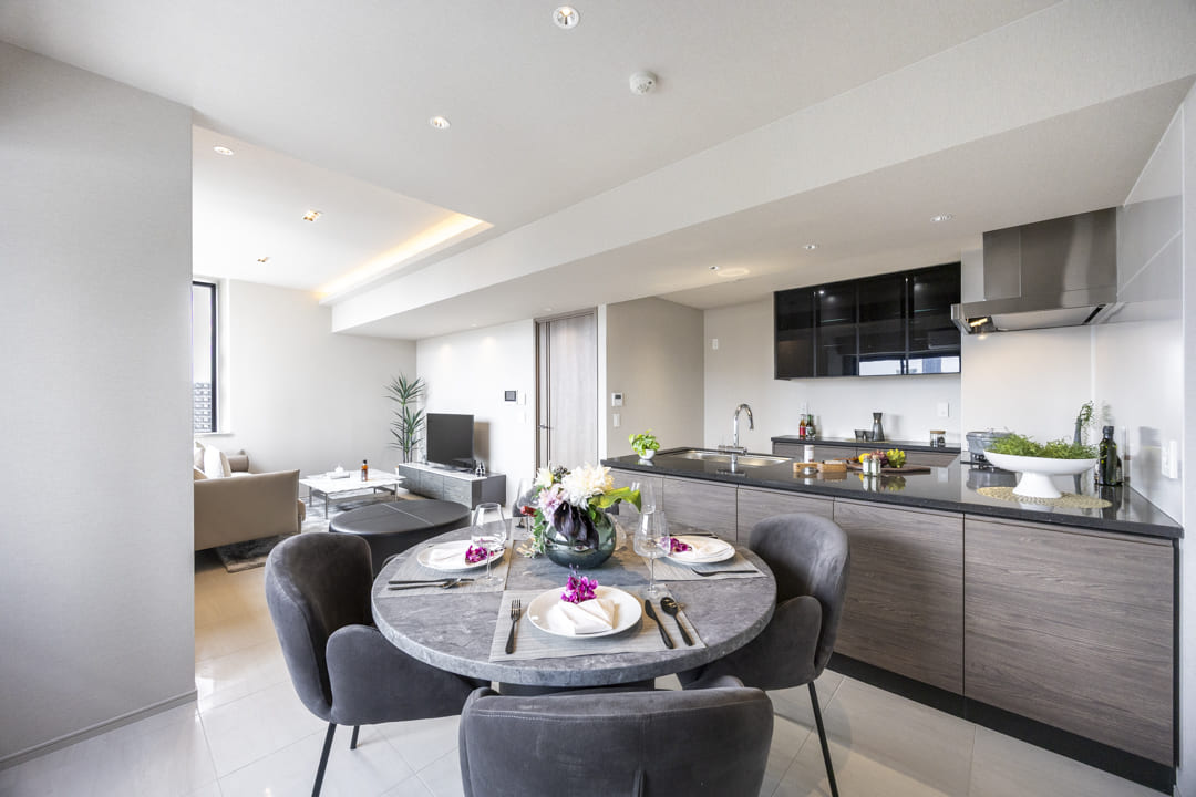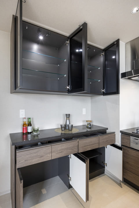 キッチンとデザインを揃えたカップボードを完備。空間に統一感をもたらしながら、充分な収納力を確保しています。食料品のストックや食器類を整然と収めることができ、キッチンまわりをすっきりと保つことができます。カウンター部分は家電の設置はもちろん、調理や配膳の補助スペースとしても活躍。機能性と美しさを両立した設計です。さらに、リビング側の戸棚に使用頻度の高い食器を収納すれば、動線もスムーズです。