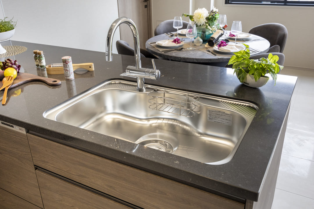 木目デザインが美しく、洗練された印象をもたらすキッチン。作業動線がコンパクトにまとまり、効率良く調理が行えるL型レイアウトです。シンク側からはリビングダイニングを見渡すことができ、ご家族とのコミュニケーションも取りやすい設計。コンロ側は壁面仕様とし、油跳ねを軽減しながらリビング側をすっきりと保てる点も魅力です。