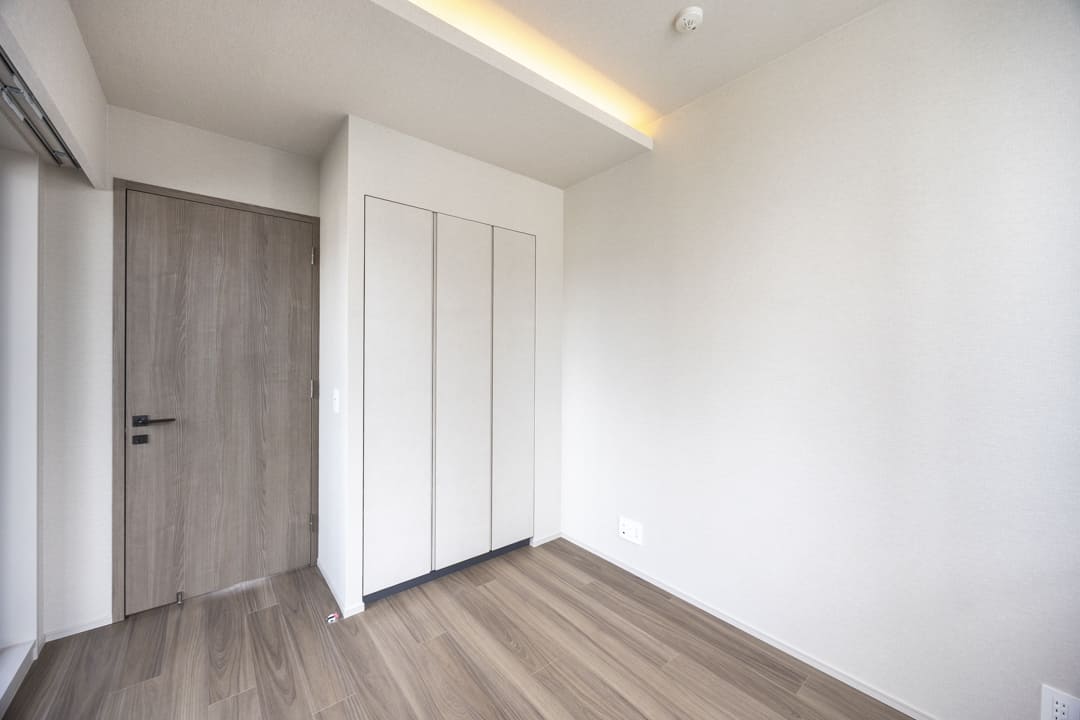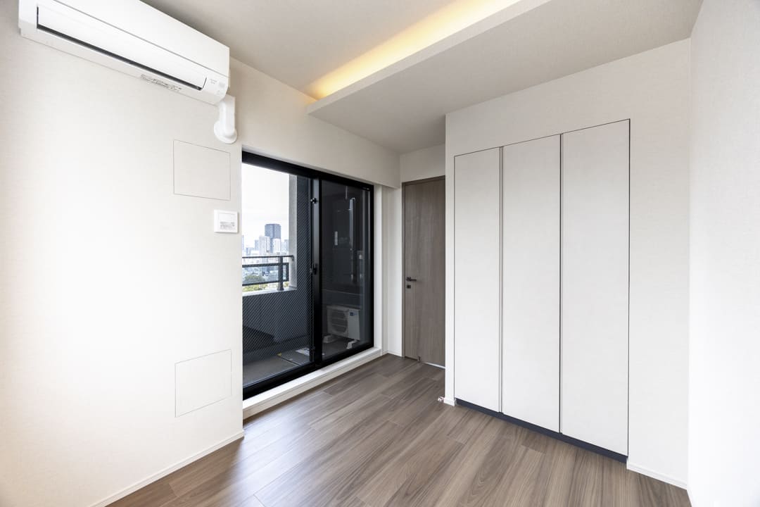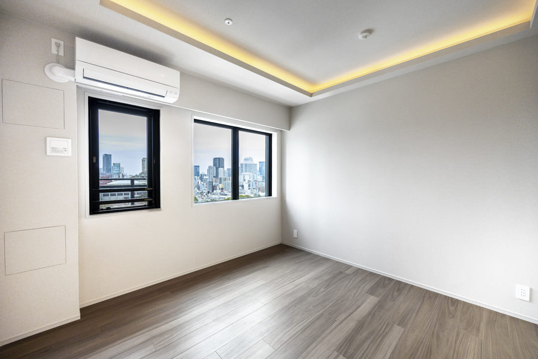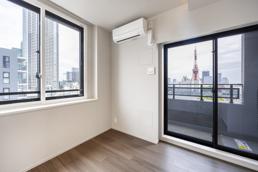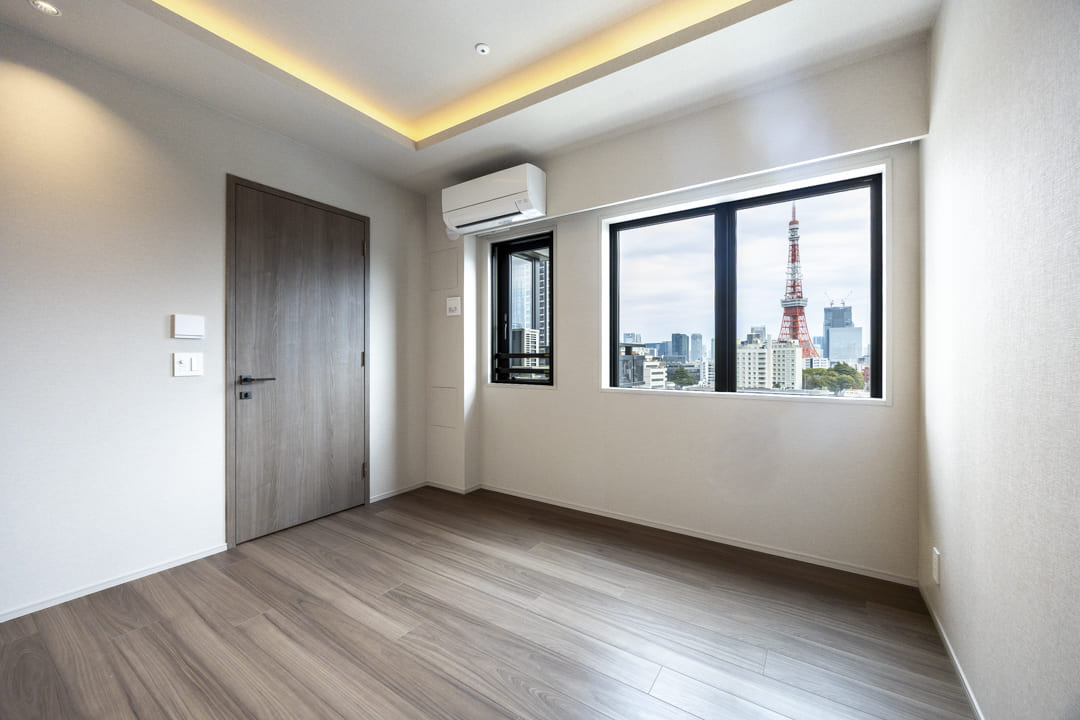 約6.0帖の寝室。バルコニーに面した北東の二面採光により、朝のやわらかな光が心地よく差し込む空間です。こちらのお部屋からも東京タワーを望むことができ、都市の景色を楽しめる眺望が広がります。クローゼットを備え、収納スペースも確保。寝室としてはもちろん、ワークスペースや書斎、趣味の部屋としても使いやすい一室です。