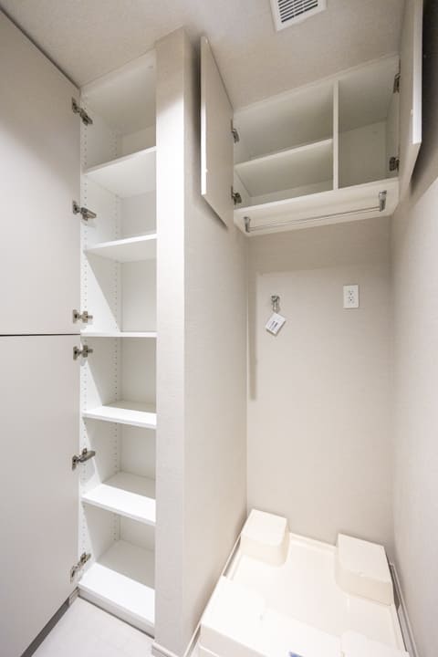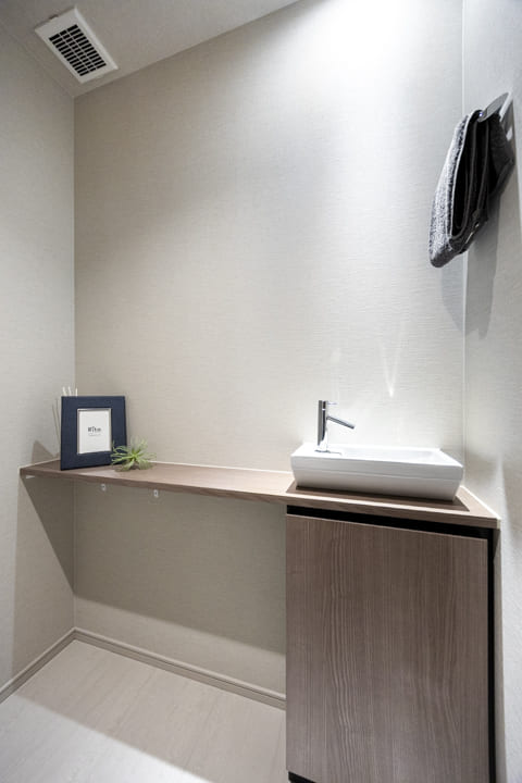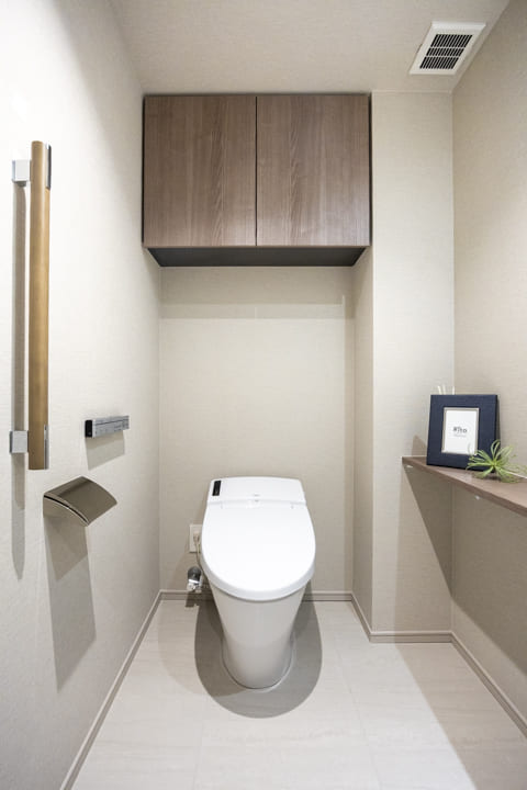 廊下に面していて独立性の高いレストルーム。LIXIL製の洗浄機能付トイレを採用しています。タンクレス仕様でスタイリッシュですね。手洗いカウンター付きのため、使用後すぐに手を洗うことができ、衛生面にも配慮された設計。ゲストを洗面室まで案内する必要がなく、スマートにお使いいただけるのも嬉しいポイントです。トイレットペーパーや掃除用品の収納に便利な吊戸棚も設置されています。