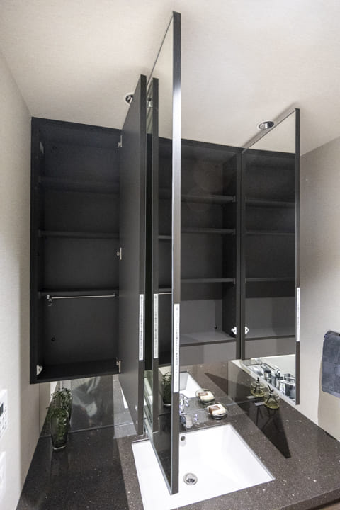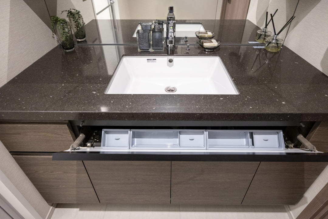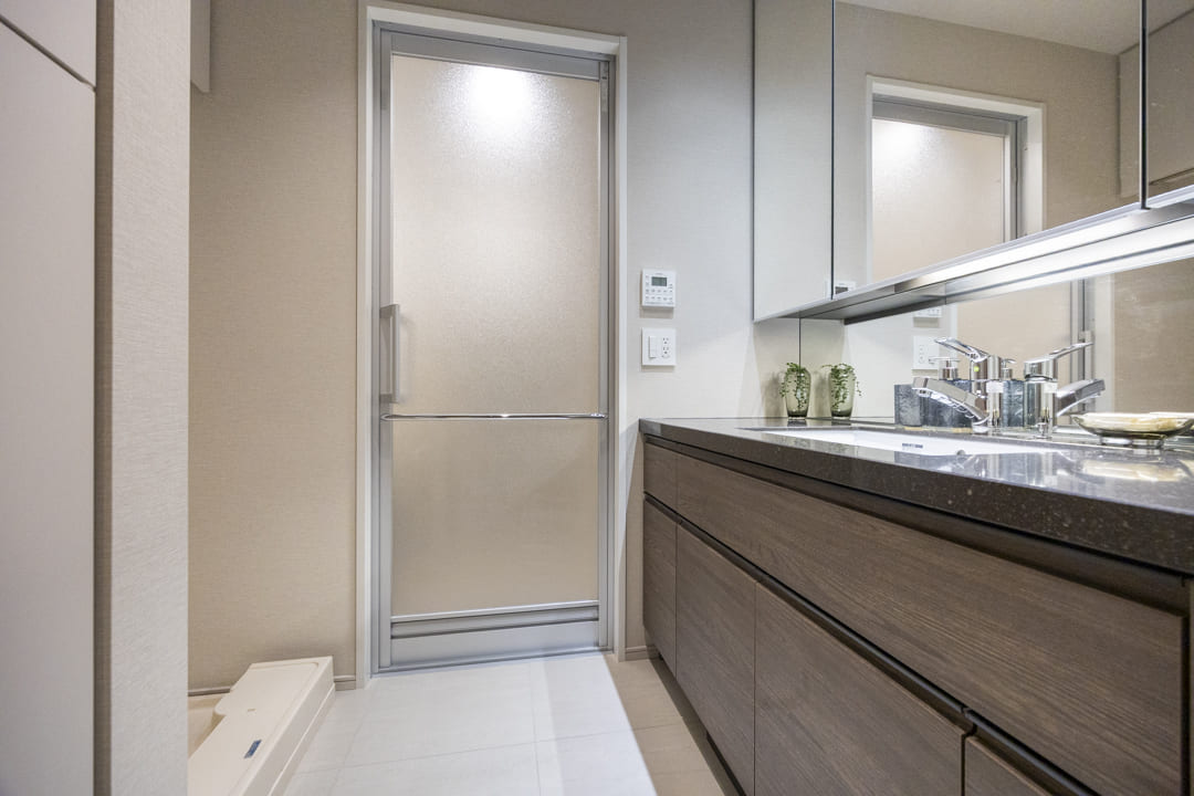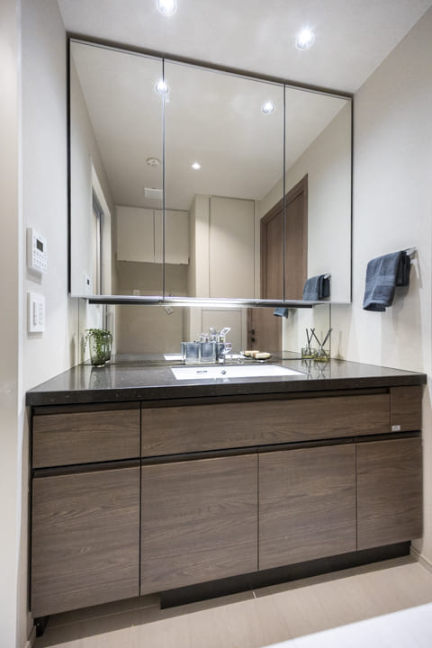 石調カウンターを採用した、落ち着いた印象の洗面化粧台。空間に自然な上質感を添えます。三面鏡付きのシングルボウル仕様で、身支度もスムーズに行えます。鏡裏は収納スペースとなっていて、洗面まわりの小物をすっきりと整理できます。さらに、背面にはリネン庫を備え、タオルやパジャマ、日用品の収納にも便利。整った空間を保ちやすく、日々を心地よく支える洗面室です。