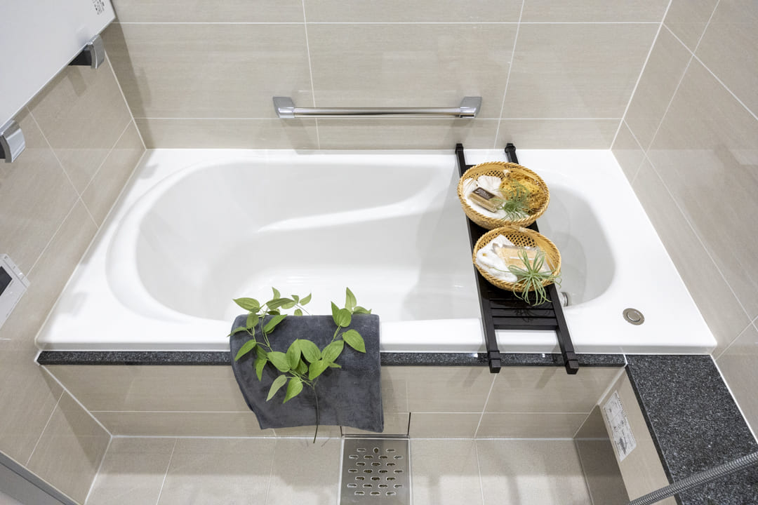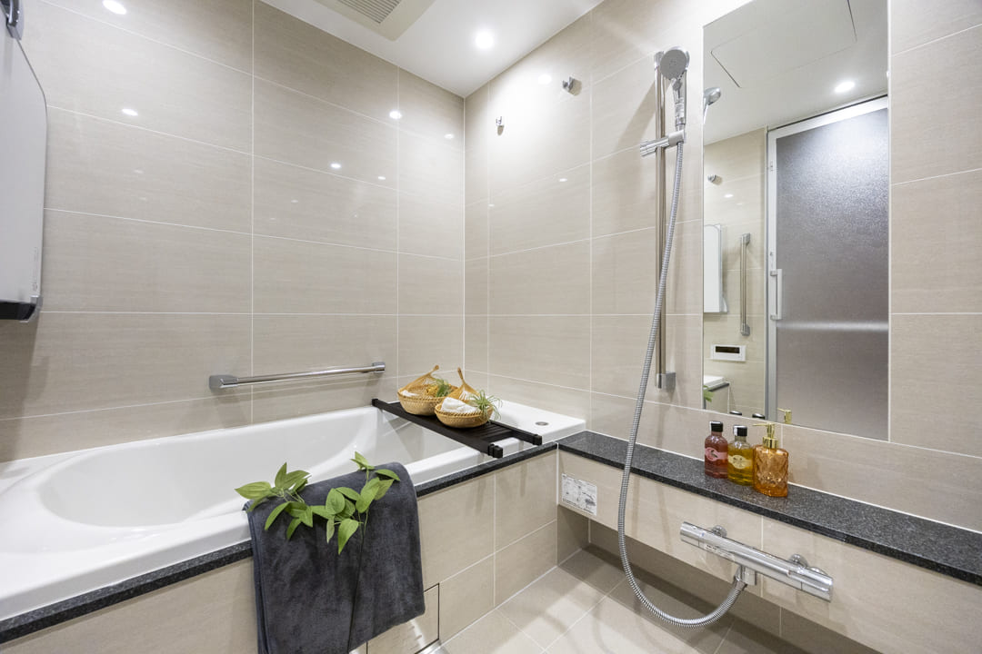 ゆとりある広さを確保したバスルーム。上質感のある空間が、心身をゆるやかにほぐします。換気・暖房・乾燥・涼風機能搭載で1年中快適なバスタイムに。雨天時の洗濯乾燥や湿気対策にも配慮された仕様です。追い焚き機能も付いているためご家族の入浴時間が異なる場合や、ゆっくり半身浴を楽しみたい時にも便利。日々の疲れを穏やかに癒す、機能性と快適性を備えています。