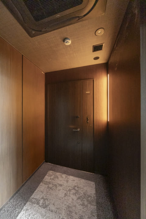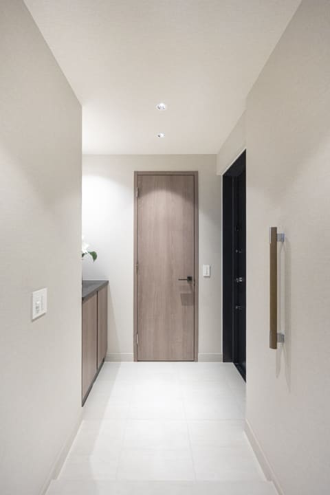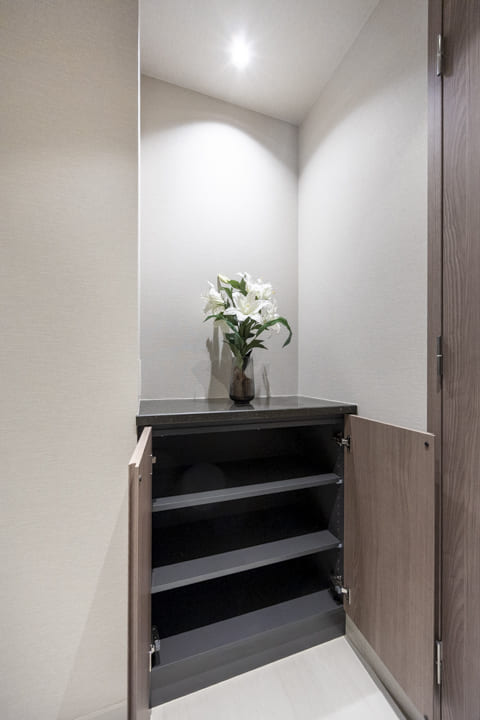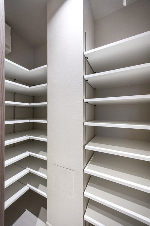 人感センサー付き照明が、帰宅時をやわらかな光で迎える玄関。荷物で両手が塞がっている時や夜遅い帰宅時にも、スムーズに室内へと入れます。右手にはSIC(シューズインクローゼット)、正面にはカウンタータイプのシューズボックスを備え、収納力も充分。靴類はもちろん、ペット用品や季節物もすっきりと収まります。さらに、廊下には可動棚を設置。日用品のストックや掃除用品なども整理しやすく、住まい全体の美観をさりげなく支えます。
