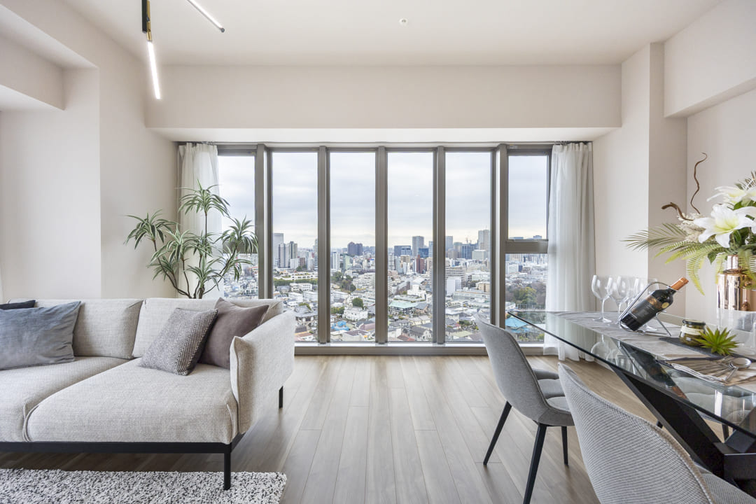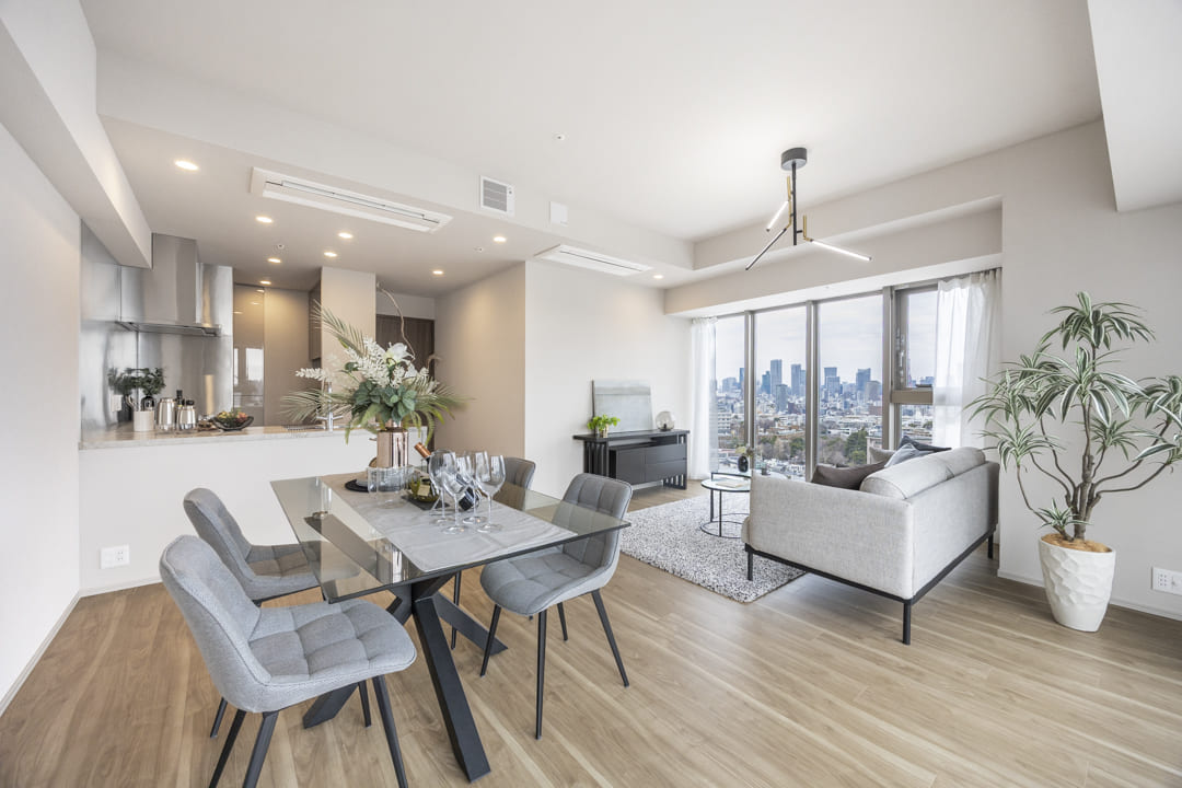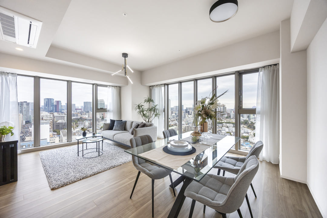 約22.4帖の広々としたリビングダイニングキッチンは、二面採光で開放感があります。南東向きのため日当たりも良好、大きな窓からは、視界いっぱいに都心の景色が広がります。室内にいながら、東京の象徴「東京タワー」が望める格別の眺望を楽しめます。