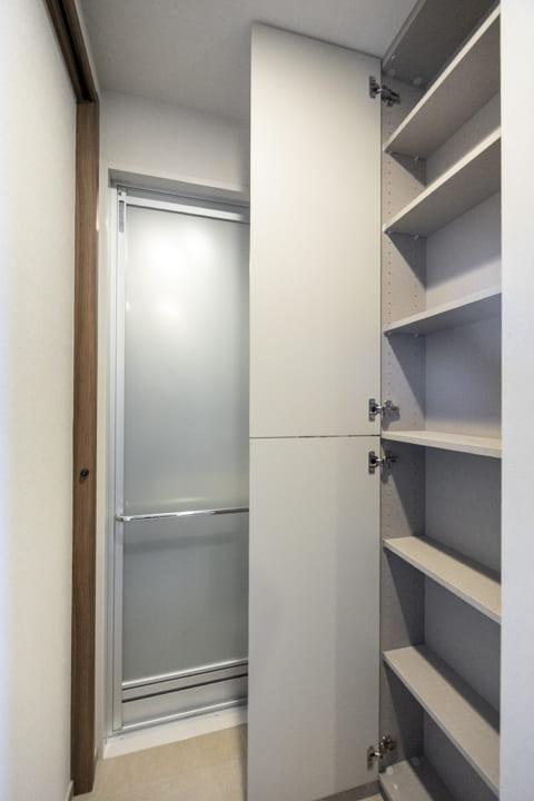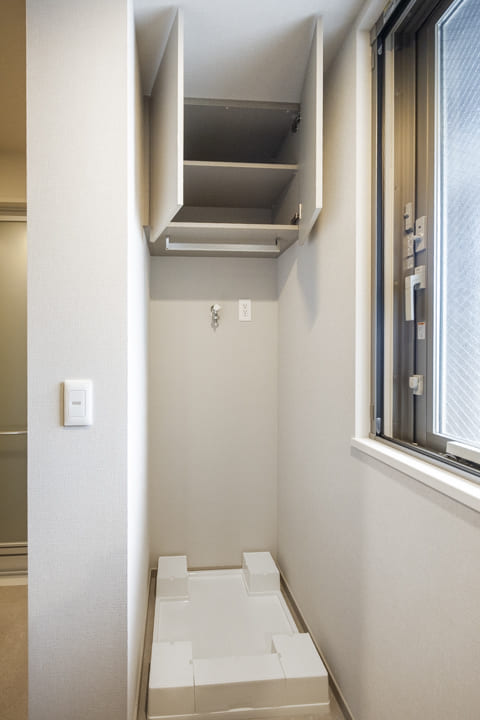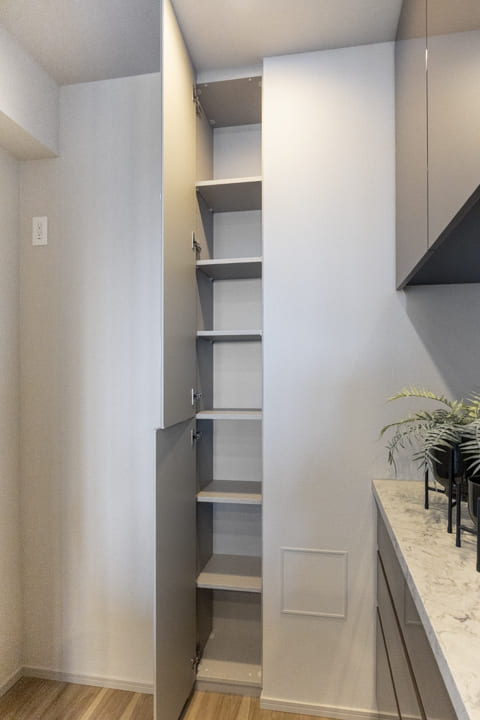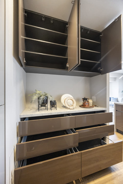 キッチン奥にはカップボードや棚が備え付けられています。調味料や食器などを収納できるだけでなく、電子レンジなどを置くこともできるので便利です。