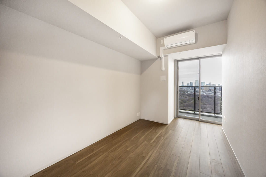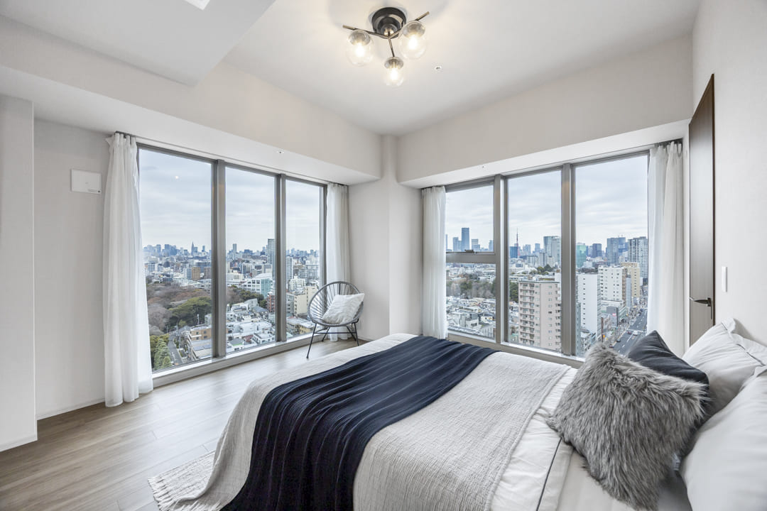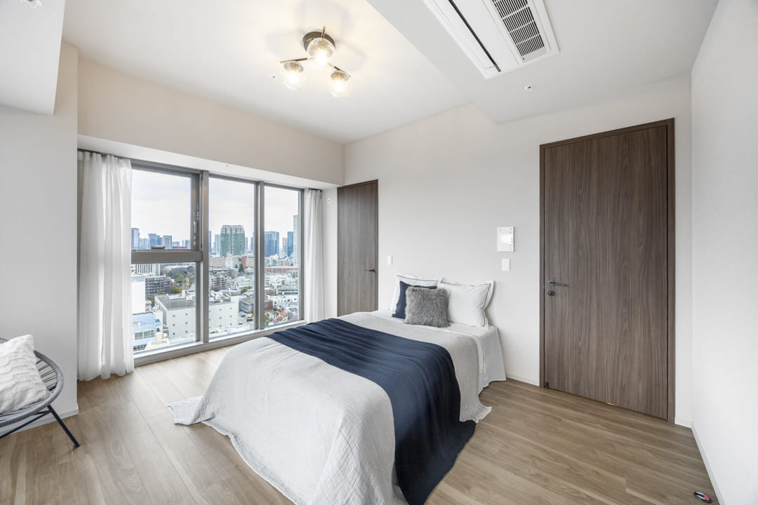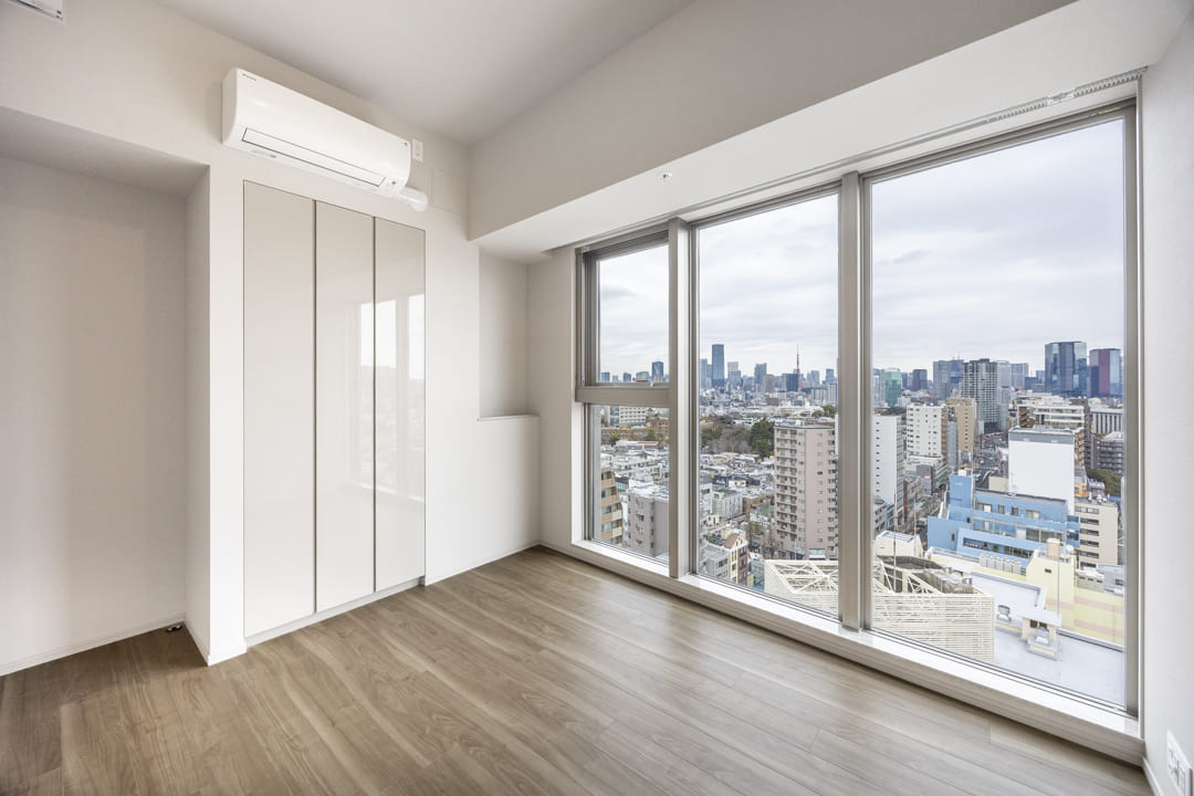 約11.0帖の寝室1も二面採光で開放的な空間。大きな窓からは、東京タワーを望む伸びやかな眺望が広がっています。東京タワーは夜間ライトアップされるため、日中は緑と青空、夜は煌びやかなタワーの灯りを楽しめます。また、奥行きのあるウォークインクローゼット付きのため、洋服や大きめの荷物もすっきりと収納することができますよ。