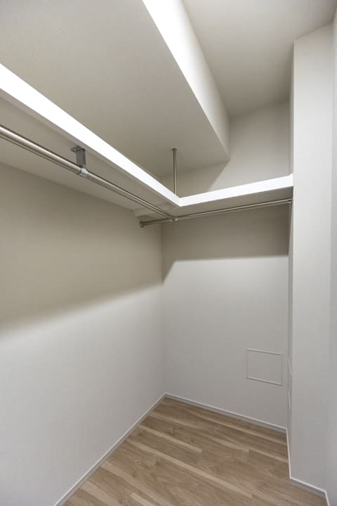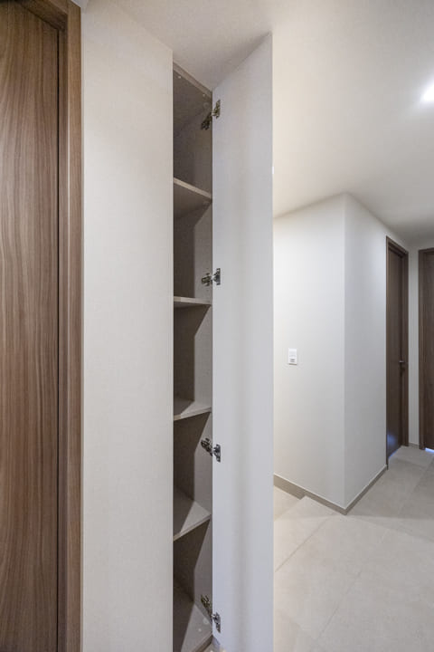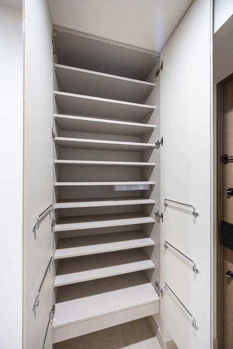 ゆったりとした玄関で、ベビーカーやスーツケースなどを持っていても出入りがしやすそうです。また、シューズボックスだけでなく、シューズインクローゼットも造られており、収納スペースが豊富。廊下収納もあります。