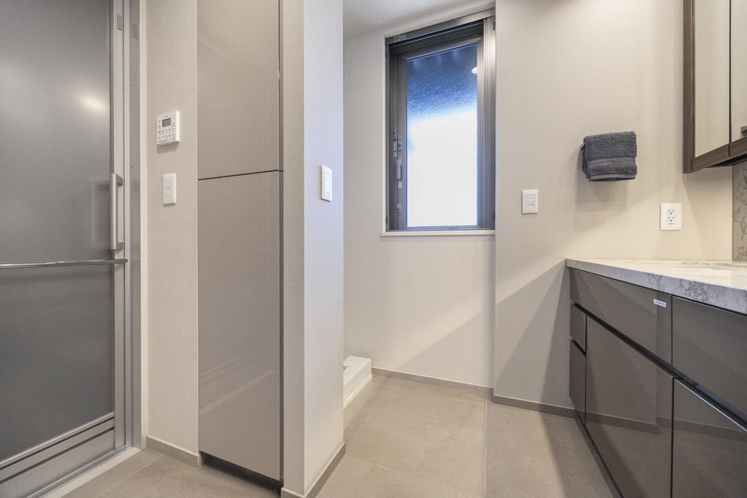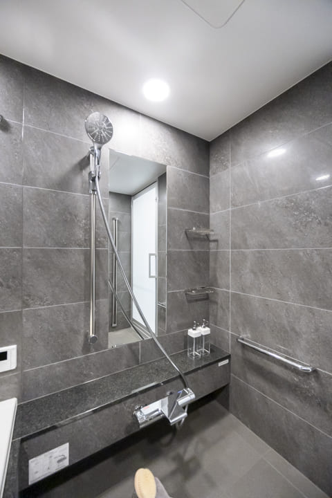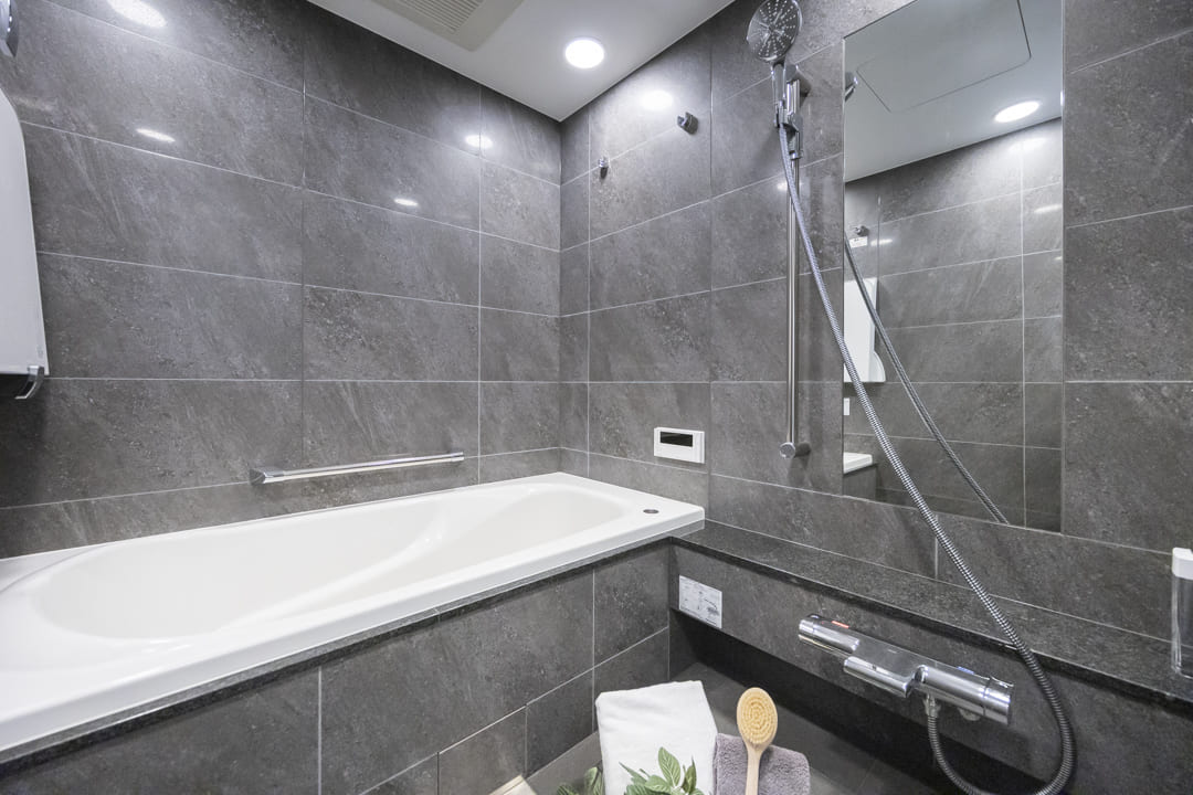 石目調でまとめられた重厚感が漂うバスルームです。お風呂にゆっくり浸かるのが好きという方に嬉しい追い焚き機能を搭載。家族の入浴時間がずれてしまっても安心です。また、浴室乾燥機には暖房・乾燥・換気・涼風の機能がついており、一年中快適に過ごすことができます。