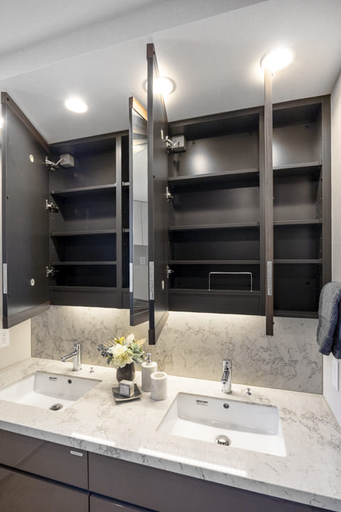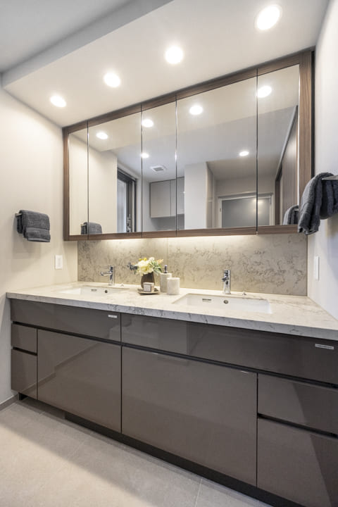 ホテルライクな2ボウル洗面の化粧台です。忙しい朝でも並んで支度ができて◎。大きなミラーボックスの中には化粧品などが収納できて使い勝手良好です。背面側にはリネン庫が造られているので、ごちゃごちゃしがちな洗面まわりもきちんと整頓させることができますよ。