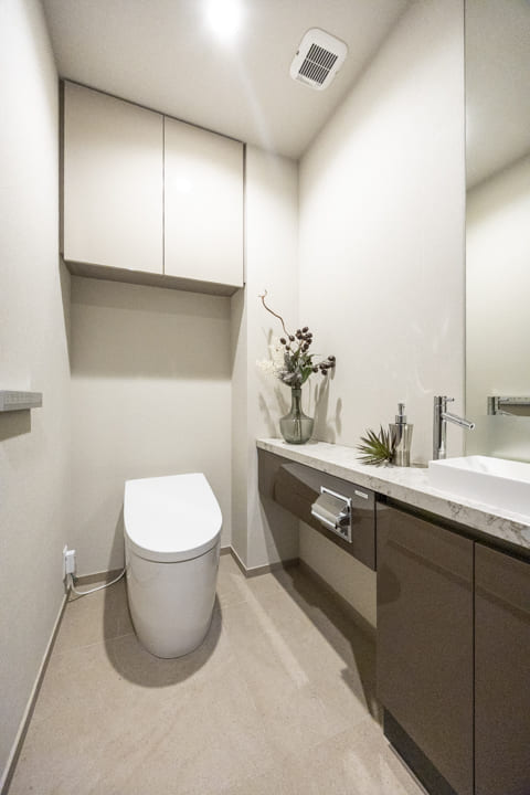 ウォシュレット一体型のトイレです。タンクレスタイプなのですっきりとした印象に。また、別途で手洗い器と鏡が造られているので、その場でサッと身だしなみを整えることができます。上部には吊戸棚が設置されていて、収納スペースもありますよ。カウンタースペースにはアロマなどを置いても◎。