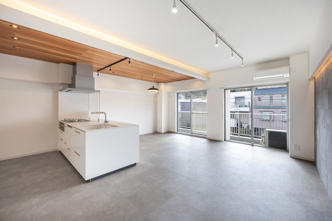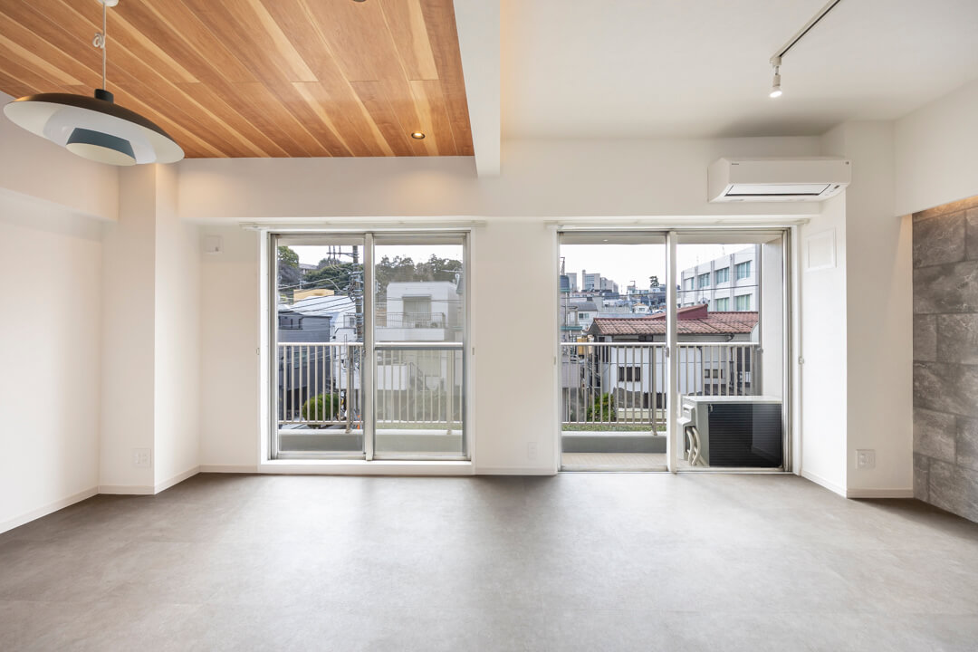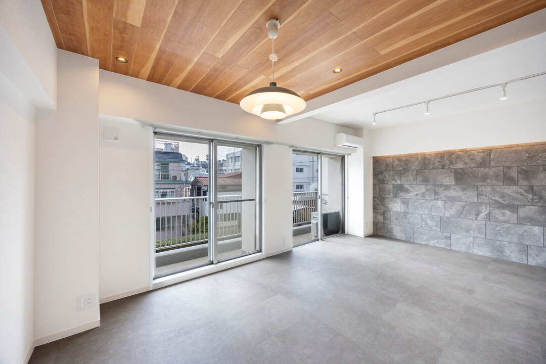 東京メトロ南北線・都営三田線「白金高輪」駅から徒歩10分。今回ご紹介する物件は約65㎡の2LDKです。LDKは約20帖で家族でゆったり過ごせる広さ。石目調のアクセントウォールや、天井のウッドパネルが施されていて、異素材MIXのお洒落な内装デザインが印象的です。南向きで陽当たりも良好。飼育細則がありますがペットとの暮らしも可能です。