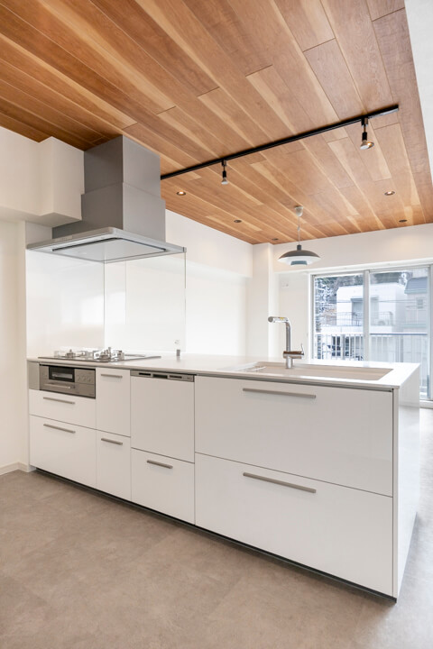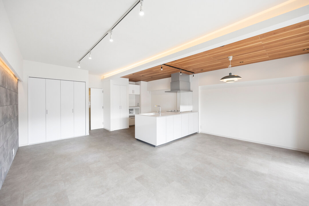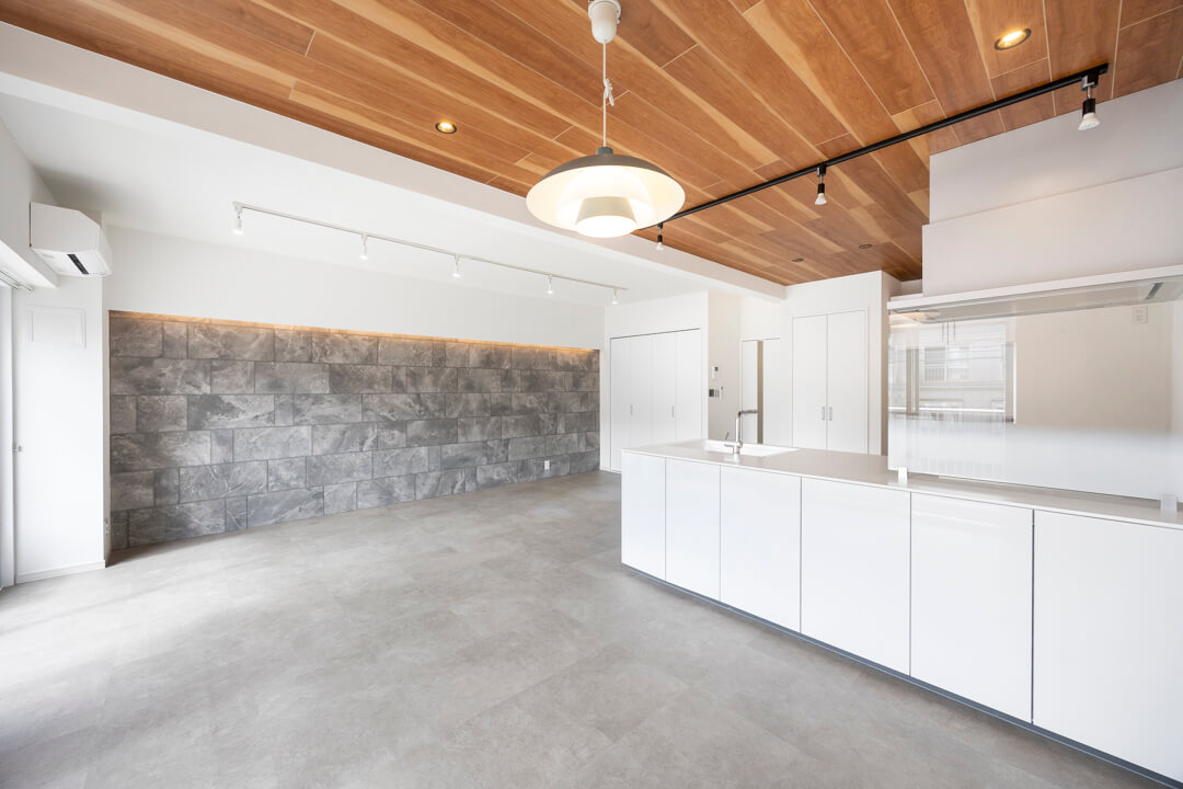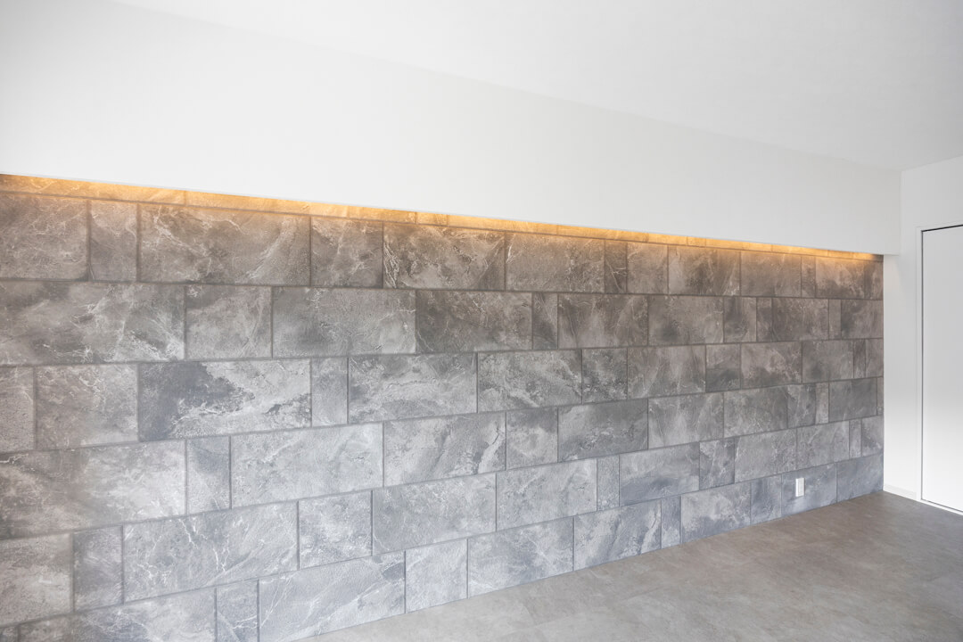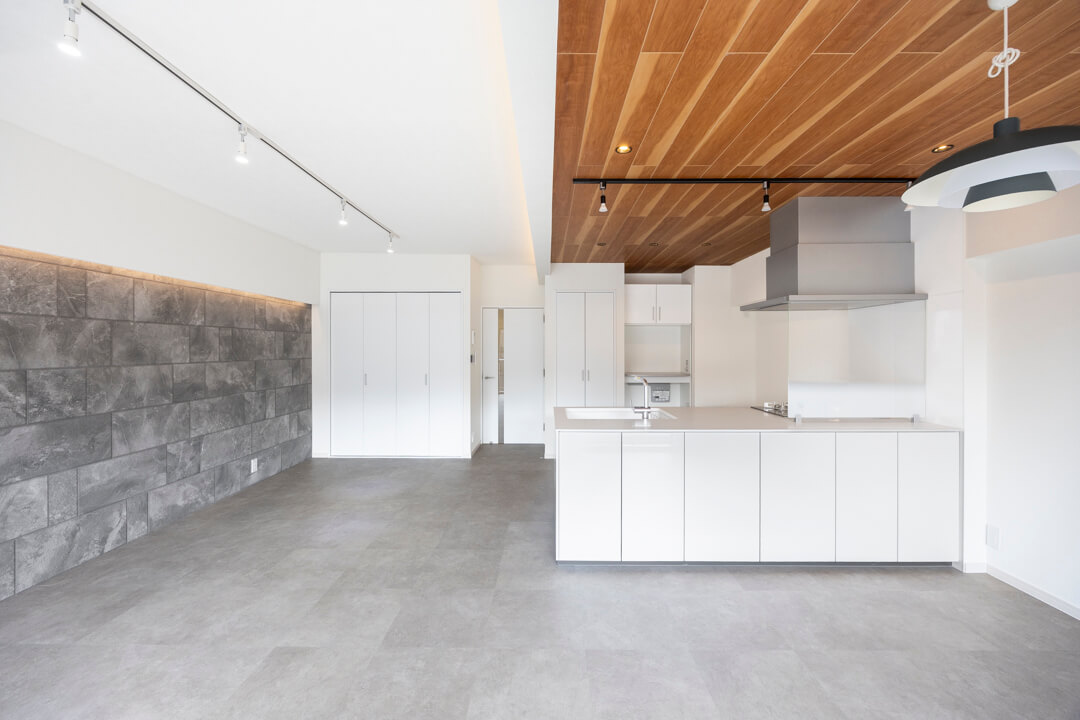 キッチンスペースを含め、約20.3帖のLDK。家族でゆったり過ごせる広さです。グレーのフロアタイル、石目調のアクセントウォールで洗練されたモダンな印象を与えつつ、天井にはウッドパネルが施されていてあたたかみのある雰囲気も感じられます。さらに間接照明も付いていて、空間の演出性を高め、やさしい光で照らしてくれます。