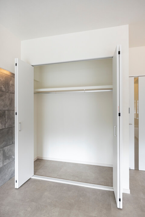 南向きにつき、自然な光が入る明るい空間。窓も2ヵ所ついていて、開放感も感じられます。リビングダイニングの一角には収納スペースも設けられています。ハンガーパイプ付きなので、季節物の洋服の収納場所にも便利です。