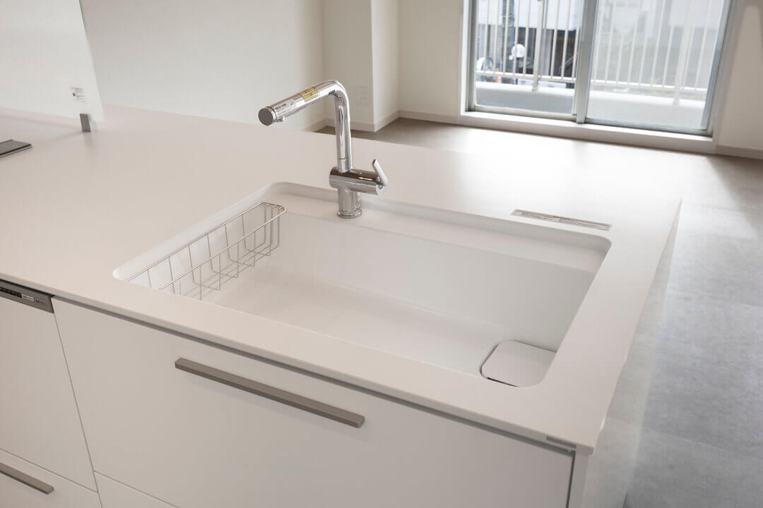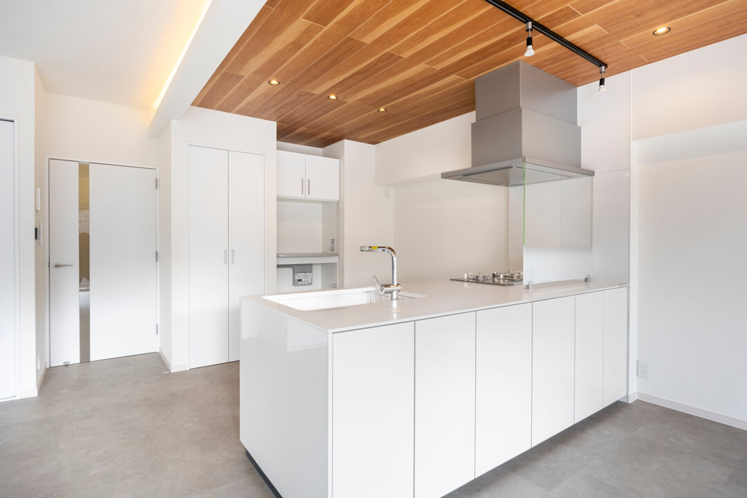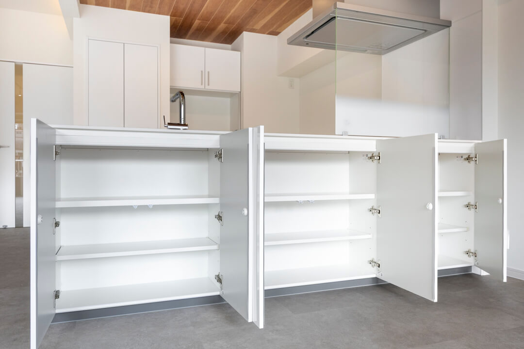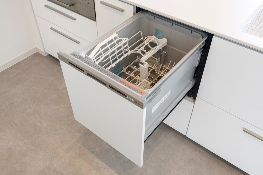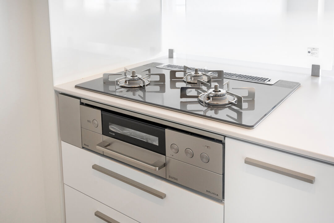 リビングダイニングが見渡せる開放的なオープンキッチン。家族やゲストと会話が弾む、小さなお子さんがいるご家庭では子どもの姿も見守れます。料理が捗る3口ガスコンロ、家事の時短に心強い食洗機付き。カップボードも設置されていて、炊飯器などのキッチン家電置場には蒸気排出ユニットも付いています。