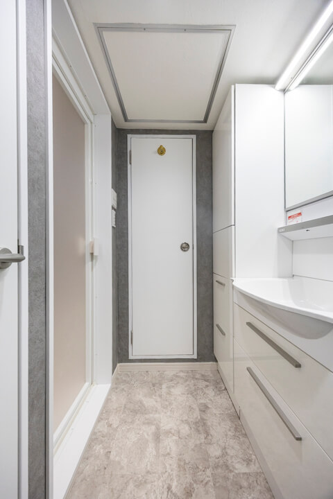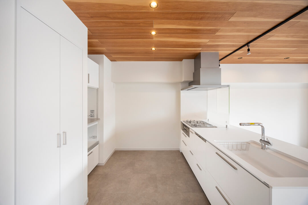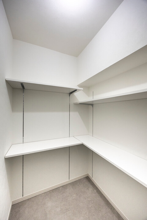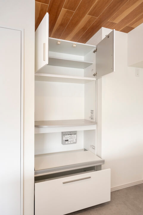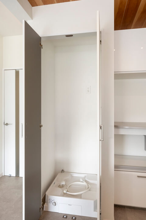リビング側の側面にも収納スペースが設けられています。キッチン用品の収納場所としてはもちろん、生活雑貨などの収納場所にも便利です。また、洗濯機置き場はキッチンに設置されていて、料理と洗濯を同時進行できる便利な動線を確保。洗濯機置き場は扉付きで目隠し可能です。
