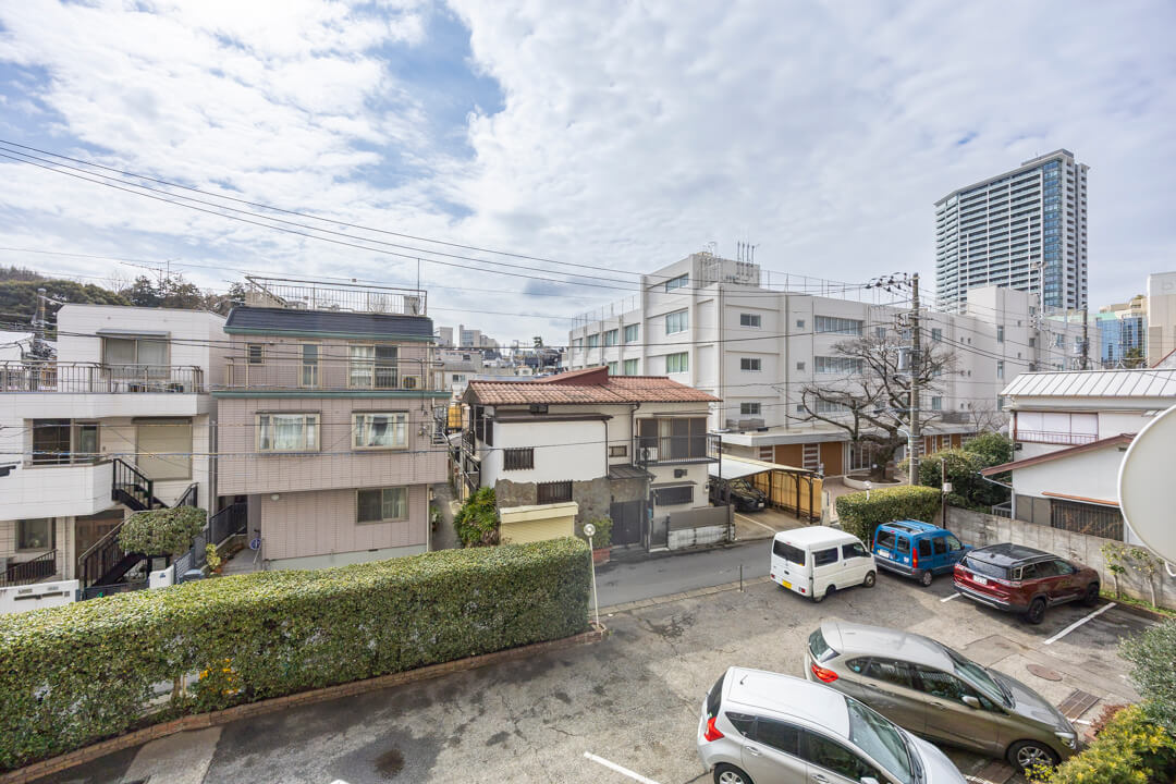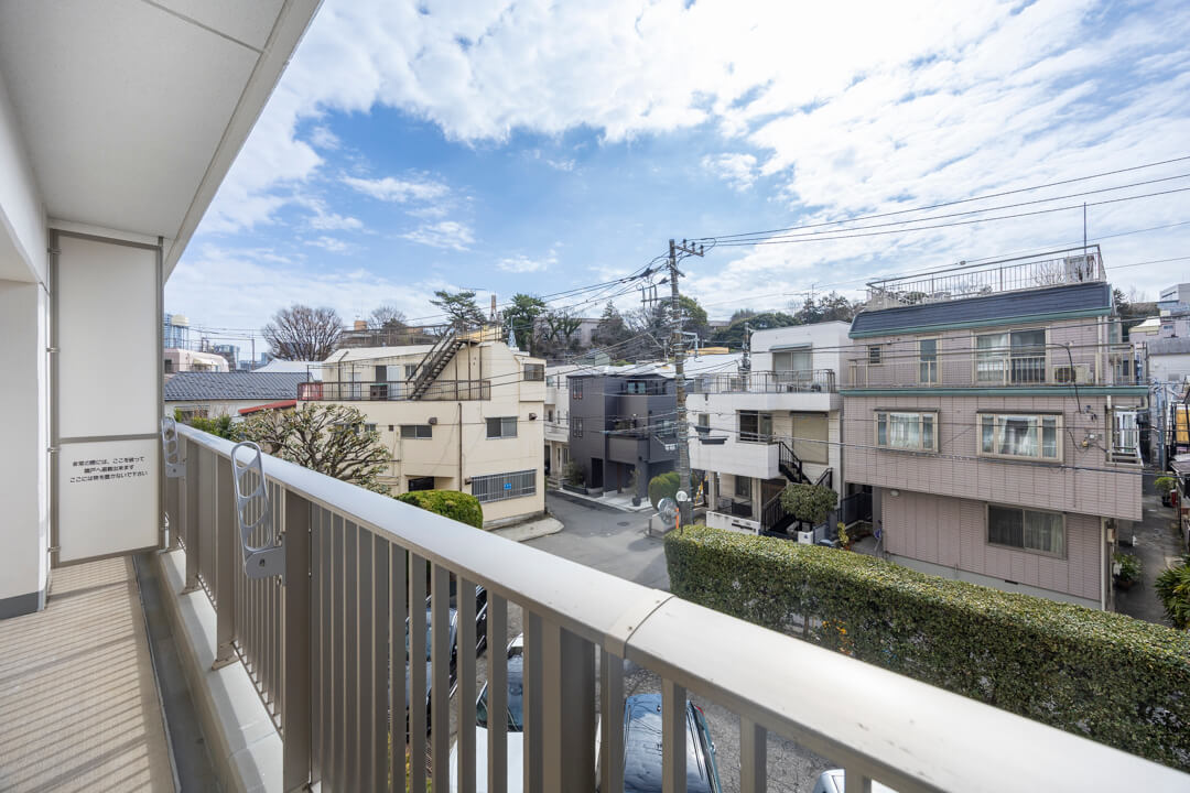 リビングダイニングに面したバルコニー。南向きで陽当たり良好です。バルコニーには植物の水やりや掃除の際に便利な蛇口が備わっています。バルコニー目の前は低層住宅が広がっており、見晴らしのいい景色となっています。