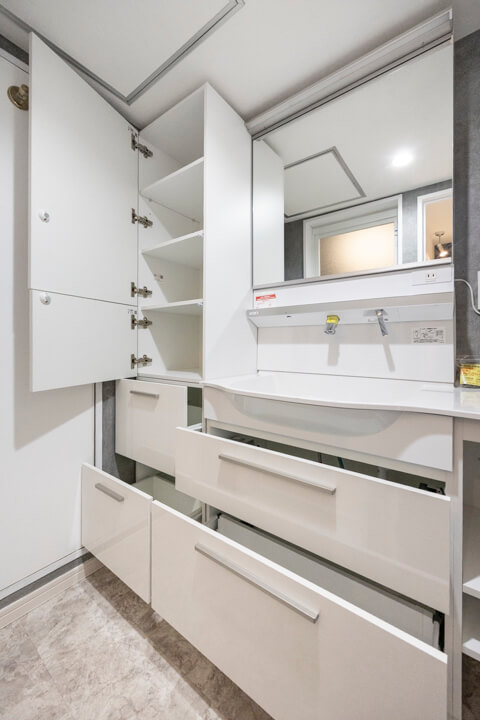 カウンタースペースが広々使える洗面化粧台。収納スペースも大容量!洗面下のキャビネットはモノの出し入れがしやすい引き出し式で使い勝手の良さもポイントです。