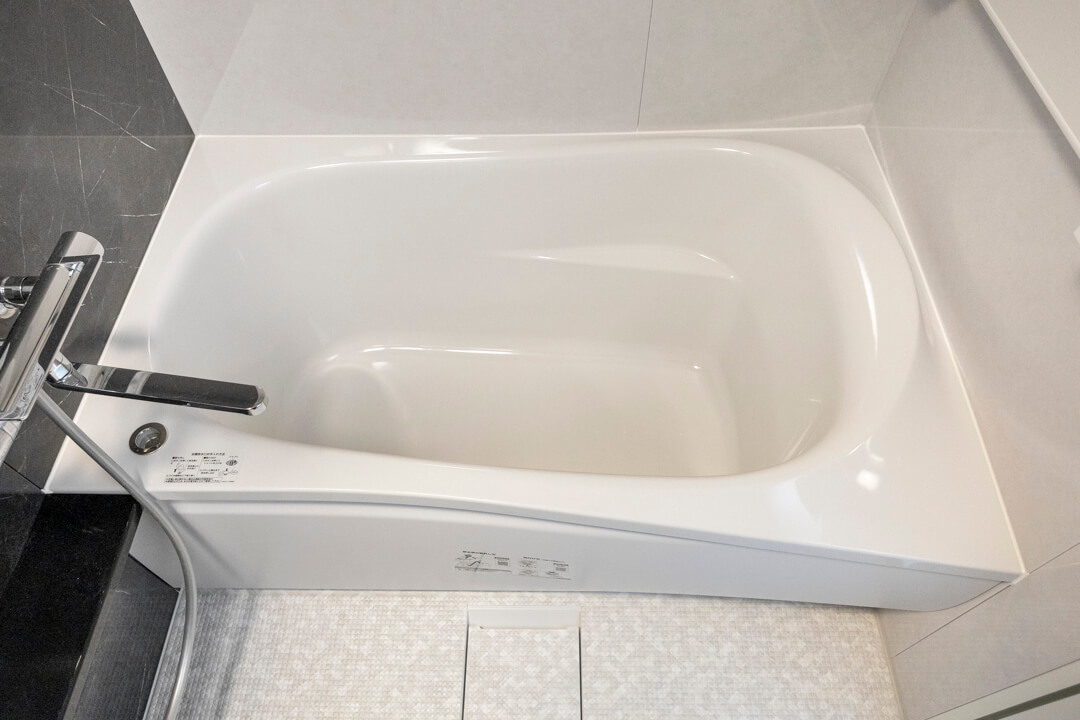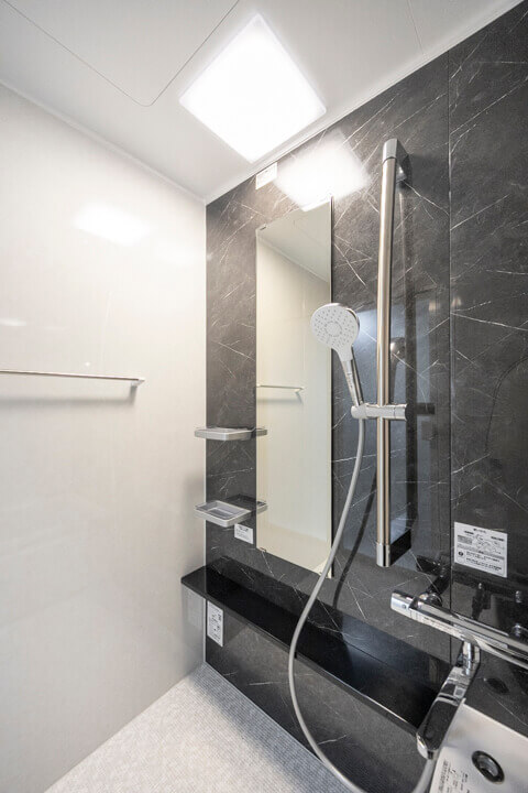 ダークトーンのアクセントパネルでスタイリッシュな雰囲気のバスルーム。追い炊き機能の他、乾燥・換気・暖房・涼風の4つの機能が備わっていて、一年中快適にバスタイムが楽しめます。