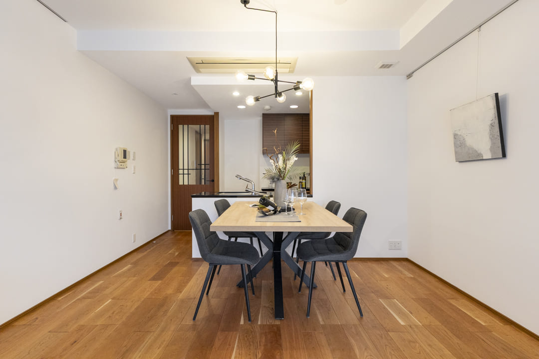 はっきりとした木目が美しいフローリングを採用。空間に温もりを添えながら、洗練されたモダンな雰囲気を演出します。壁面にはピクチャーレールを設け、アートや写真をさりげなく楽しむことができます。