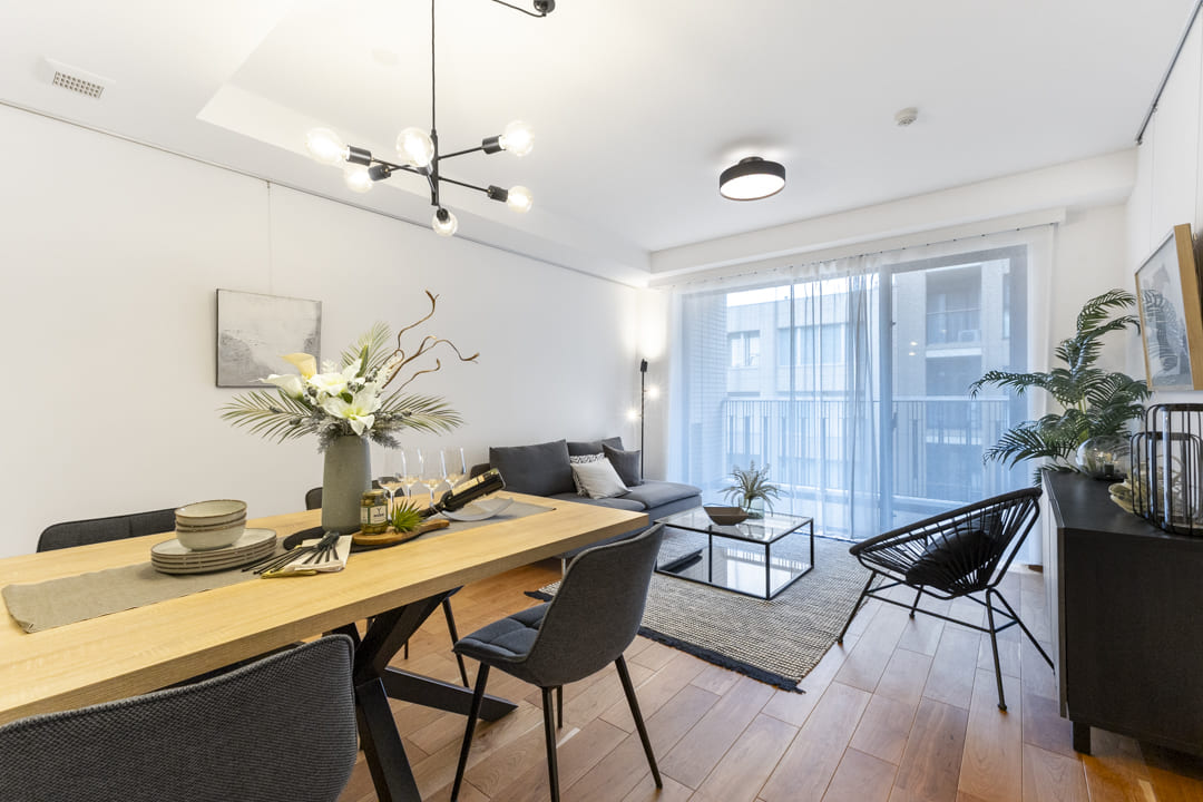 キッチンスペースを含めて約17.8帖のリビングダイニング。南向きバルコニーに面し、明るさと広がりを感じられる空間です。ビルトインエアコンを採用し、生活感を抑えながら室内全体をすっきりと保てるのも魅力のひとつ。快適性と意匠性を兼ね備えています。