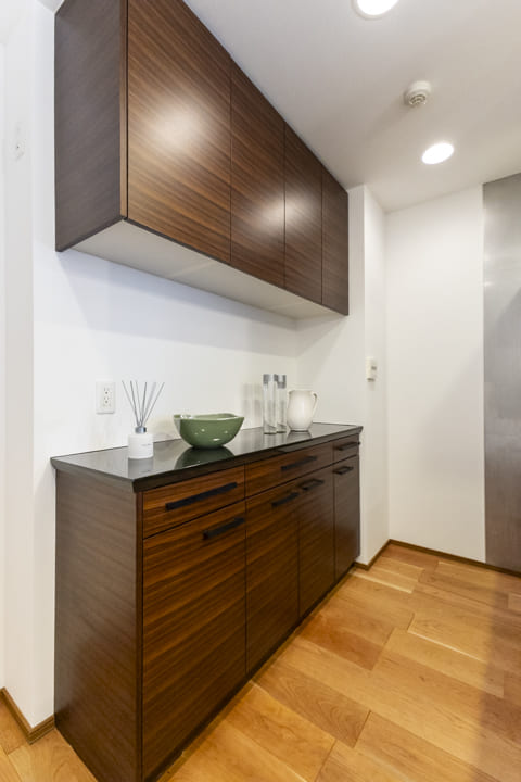 背面にはキッチンと同じデザインのカップボードを完備。統一感があり、新しく食器棚を購入する必要がなくて助かります。食料品のストックや食器類を整頓でき、いつも清潔なキッチン空間をキープ。カウンタータイプのため、作業スペースとしても活躍しそうです。