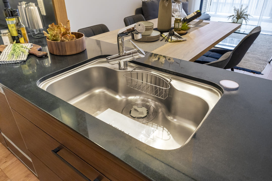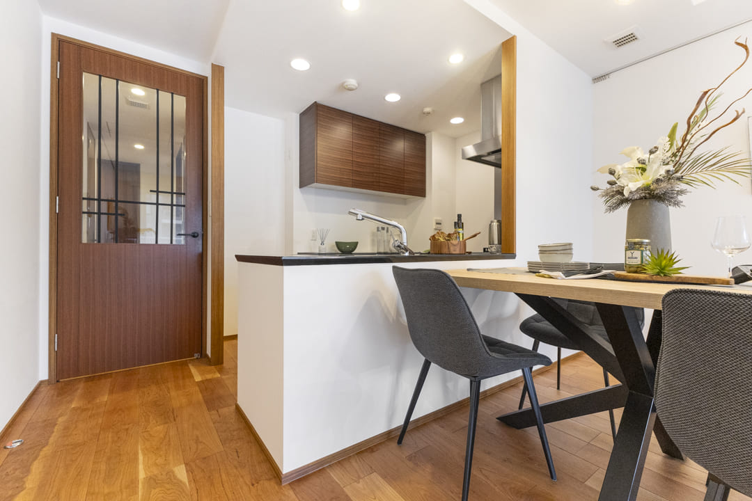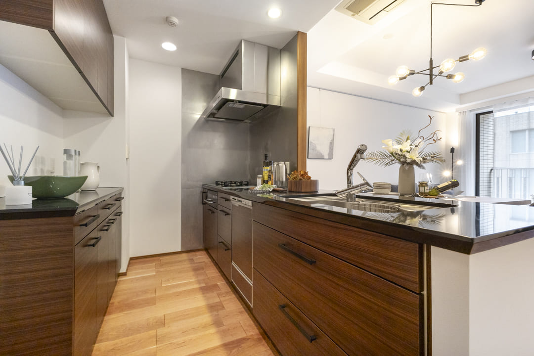 木目デザインが空間に調和する、家具のようなキッチン。シンク側からはリビングダイニングを見渡すことができ、開放的な気分で調理ができます。家族やゲストとの会話が弾みそうですね。コンロ側は壁面仕様となっており、油跳ねを軽減し、リビング側をすっきりと保つことができます。