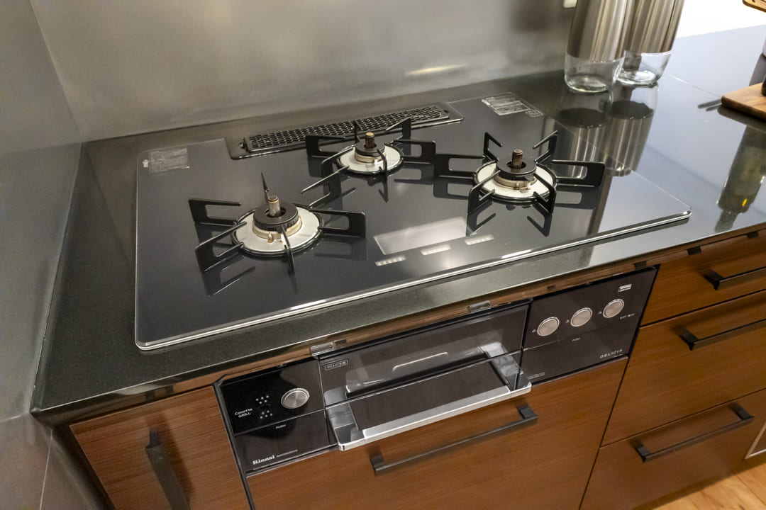 同時調理が叶うグリル付3口ガスコンロを内蔵。さらに、ディスポーザー、食洗機も完備されています。料理後すぐに生ゴミを処理できるので、悪臭の原因を防ぎ、掃除の手間を軽減。食器洗いも捗り、後片付けの時短が叶います。