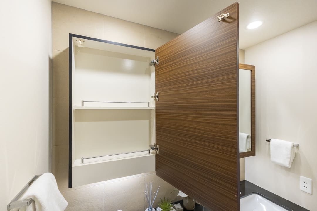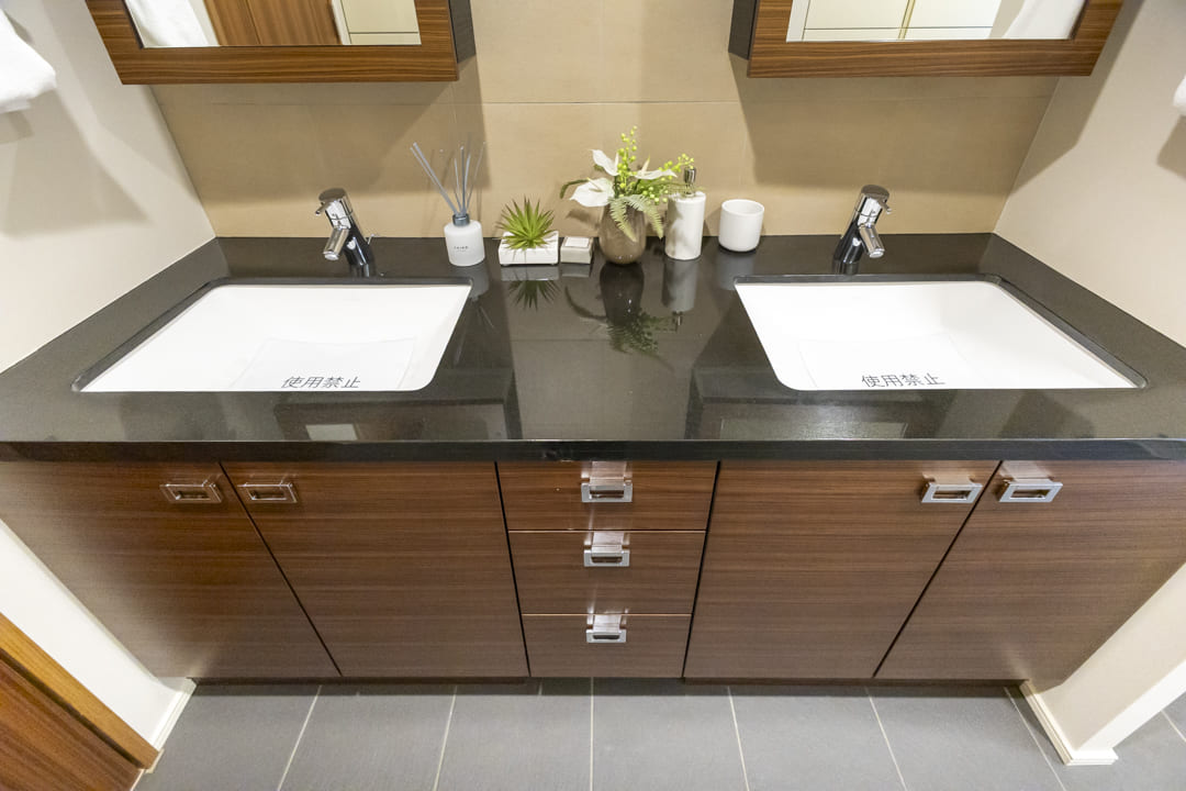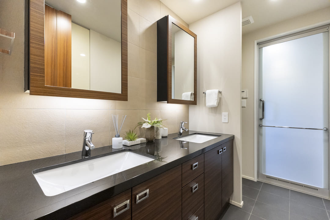 2つの洗面ボウルが並ぶ、ホテルライクな洗面化粧台。2人同時に使用でき、忙しい朝の身支度にもゆとりが生まれます。広々としたカウンターは化粧品やドライヤーの仮置きもできて便利。ミラーボックスと足元の収納に加え、大容量のリネン庫も備わっていて収納性に優れています。いつも清潔な洗面室をキープできそうですね。