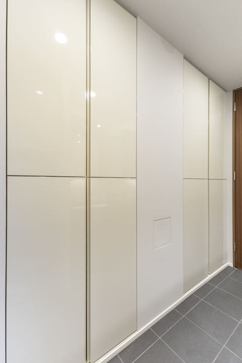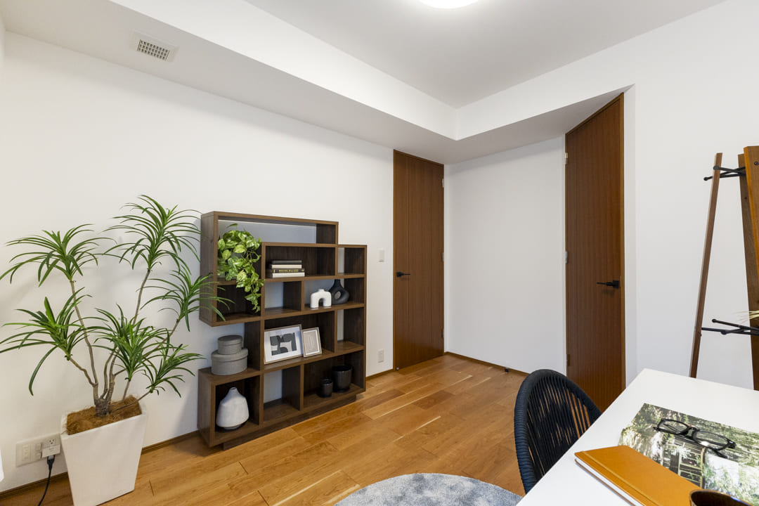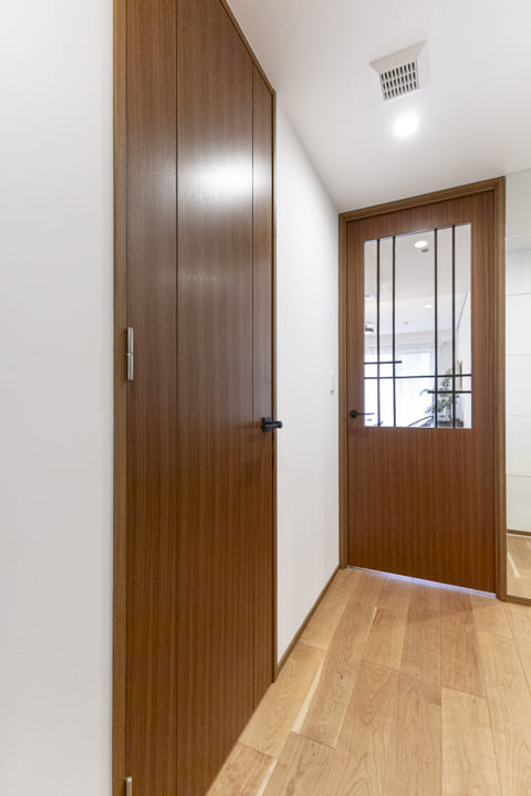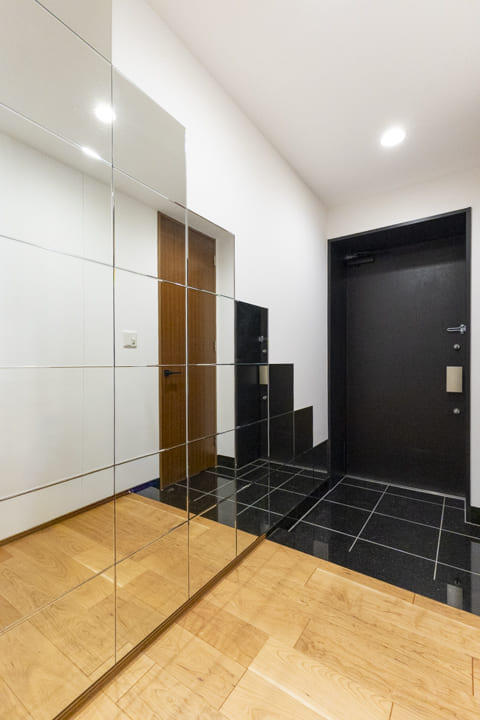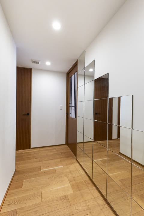 段々に構成されたミラーが目を引く玄関スペース。空間に奥行きをもたらすとともに、光をやわらかく反射し、広がりを感じさせます。アートのような存在感が、住まいの第一印象を美しく彩ります。約0.9帖のSIC(シューズインクローゼット)と約1.2帖の納戸を備え、収納性の高さも魅力。靴はもちろん、トランクケースや季節家電といった大きな荷物も収納でき、すっきりとした居住空間を実現できそうです。