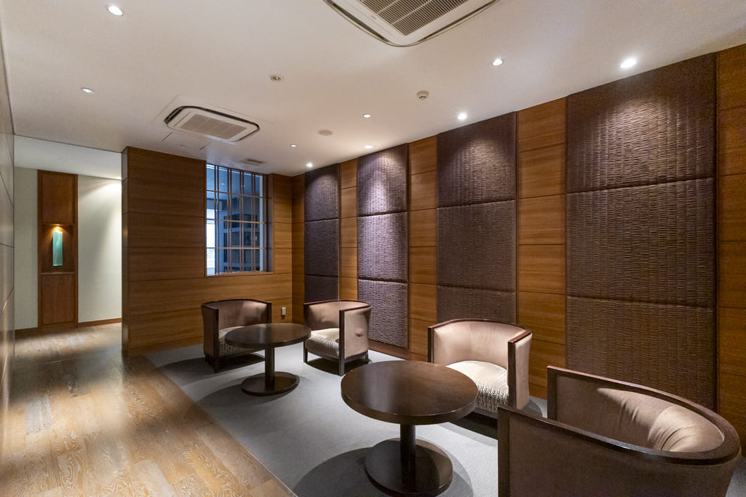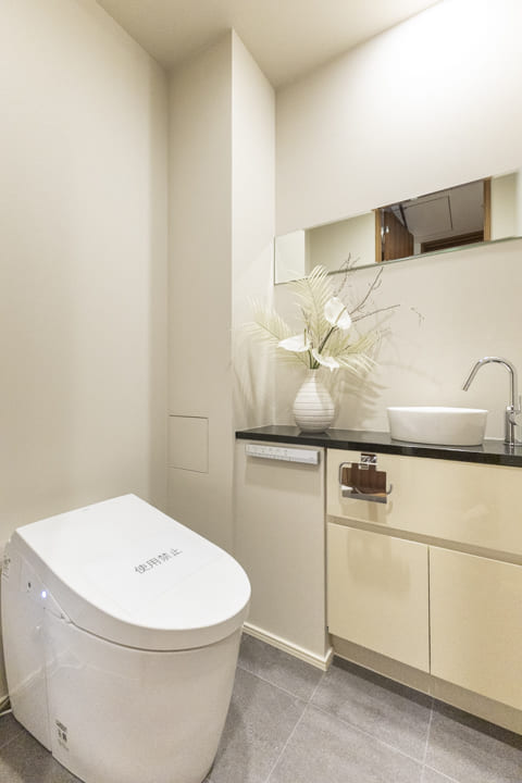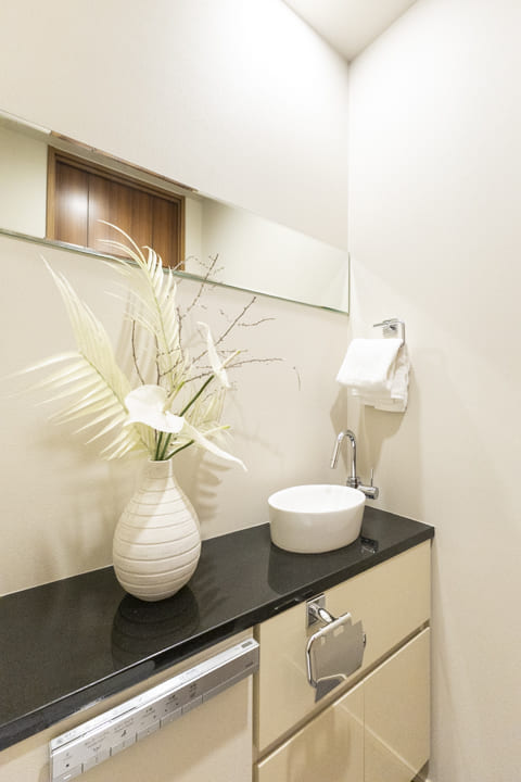廊下に面していて独立性の高いレストルーム。手洗いカウンターを備えたスタイリッシュな空間です。すぐに手を洗うことができ、ゲストを洗面室まで案内する手間がかからないのも助かりますね。TOTO製の洗浄機能付トイレに交換済みです。