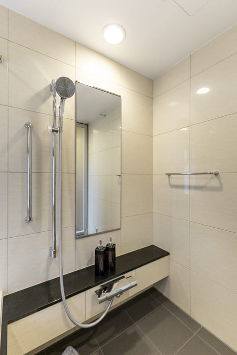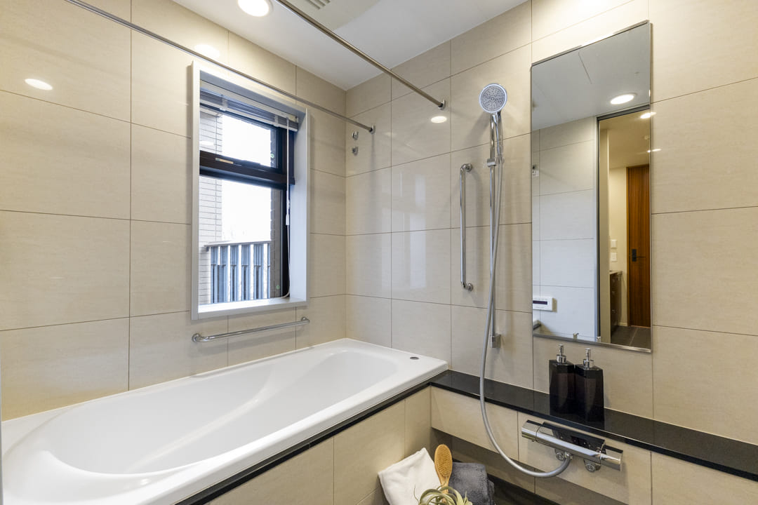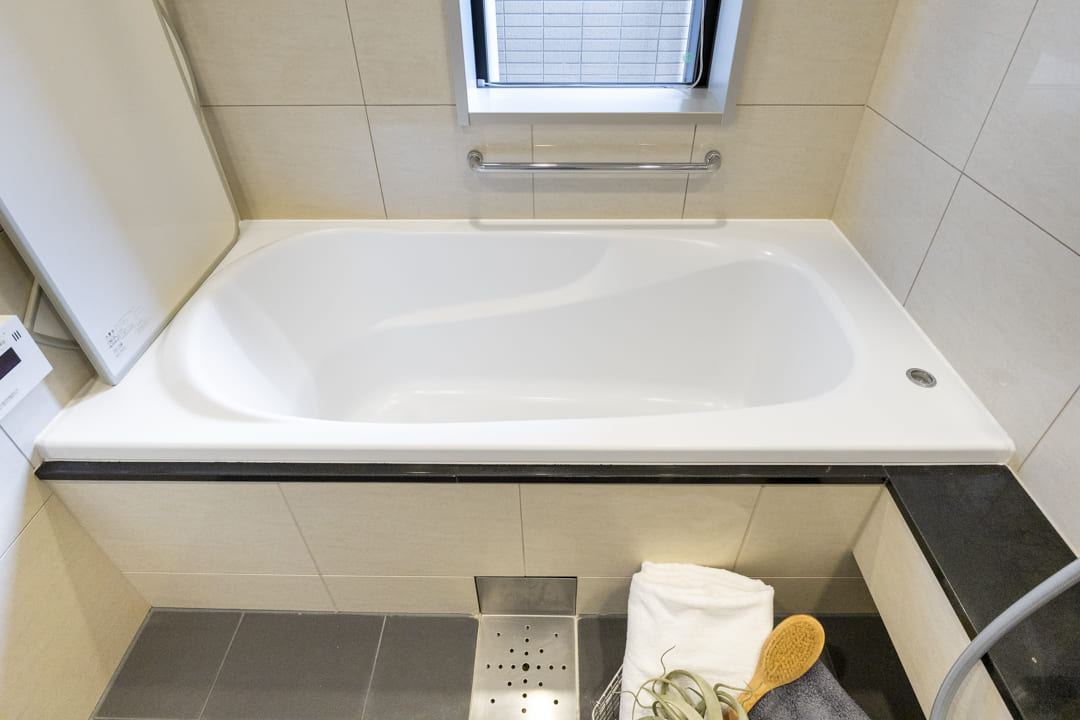 タイルデザインで上質な雰囲気が漂うバスルーム。サービススペースに面する窓付きで、明るく開放的な空間です。自然換気できるのも嬉しいですね。換気・暖房・乾燥・涼風機能付きで1年中快適なバスタイムに。雨天時の洗濯乾燥や湿気対策にも配慮された仕様です。追い焚き機能も搭載されているので、家族の入浴時間がずれてしまった時、半身浴をしたい時に助かります。