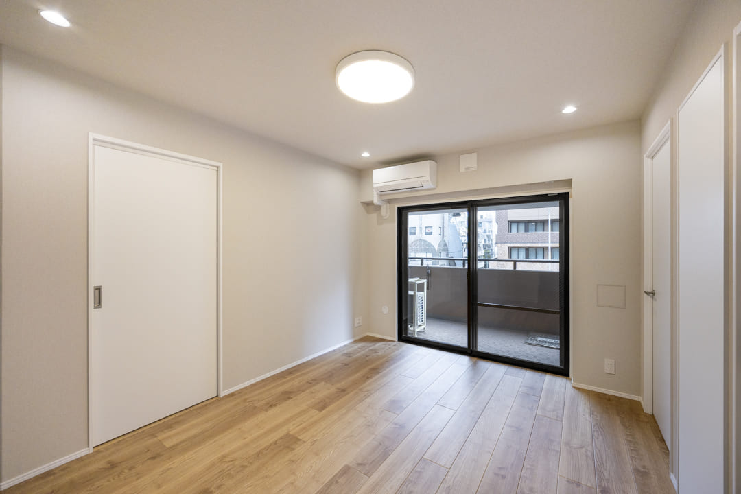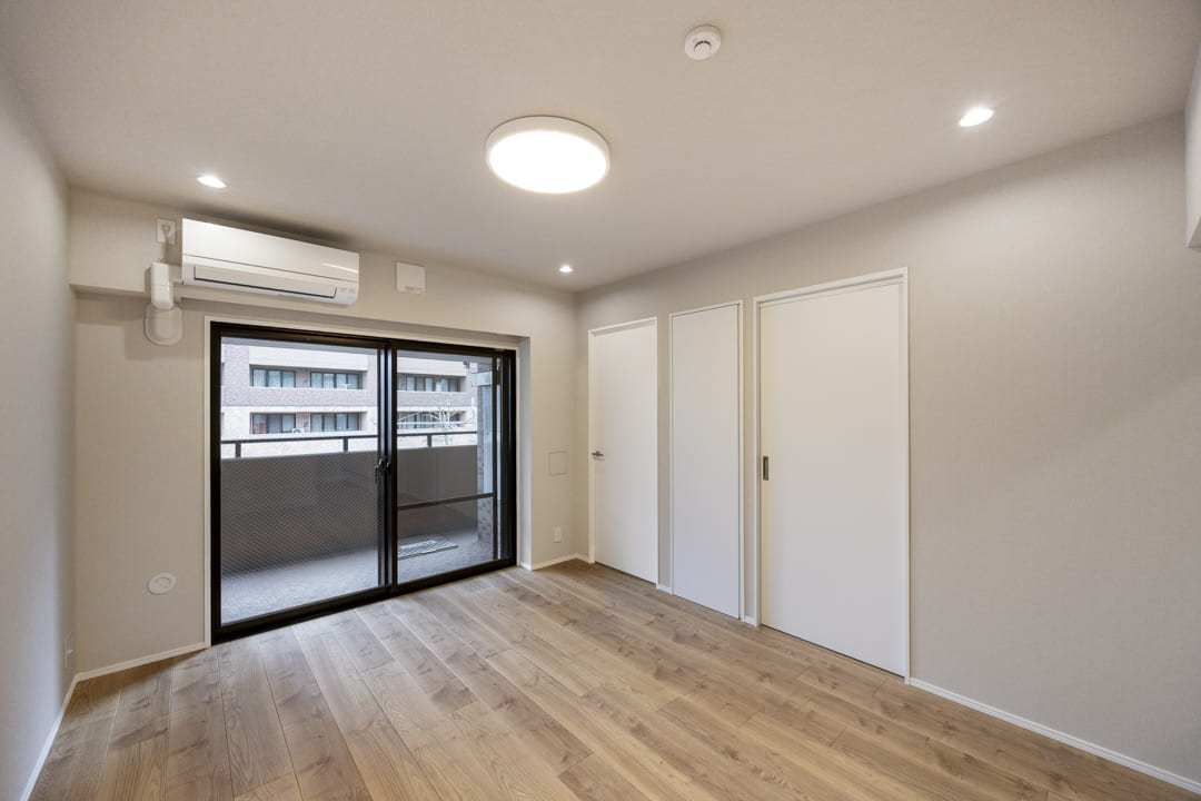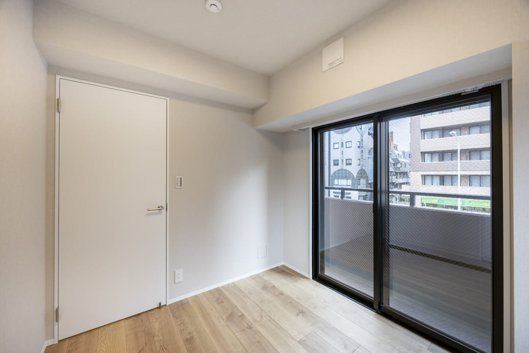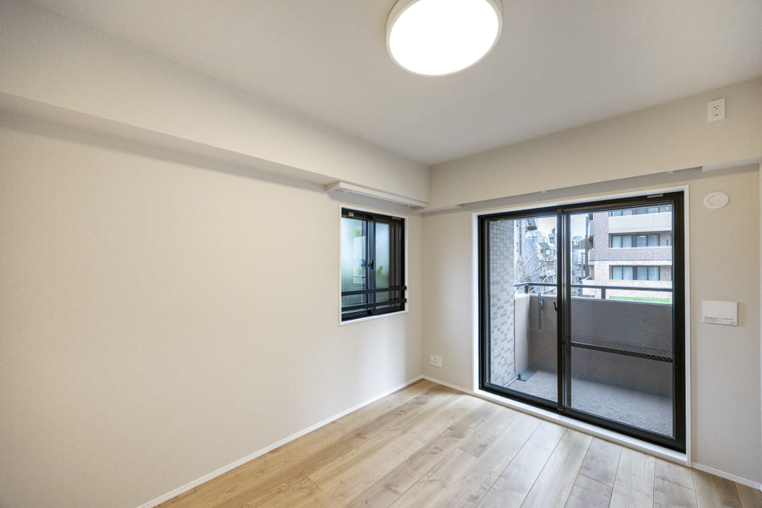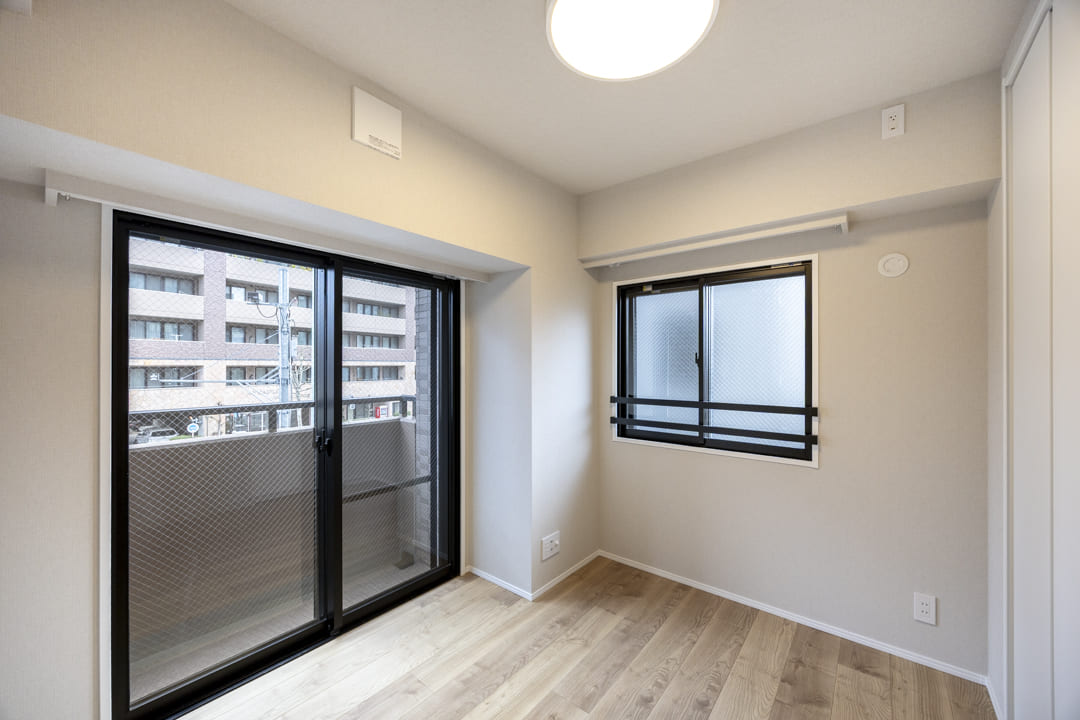 約4.5帖の洋室1も二面採光です。バルコニーへアクセスできる窓は、二重サッシになっているので、防音・断熱効果が期待できますよ。また、クローゼットも完備されています。