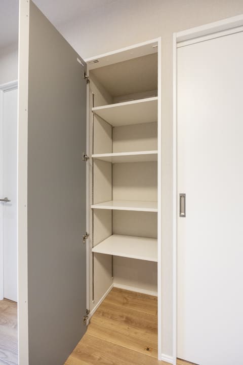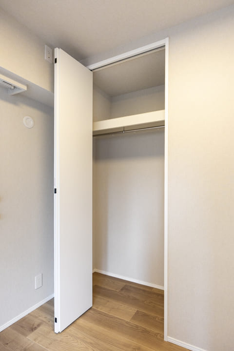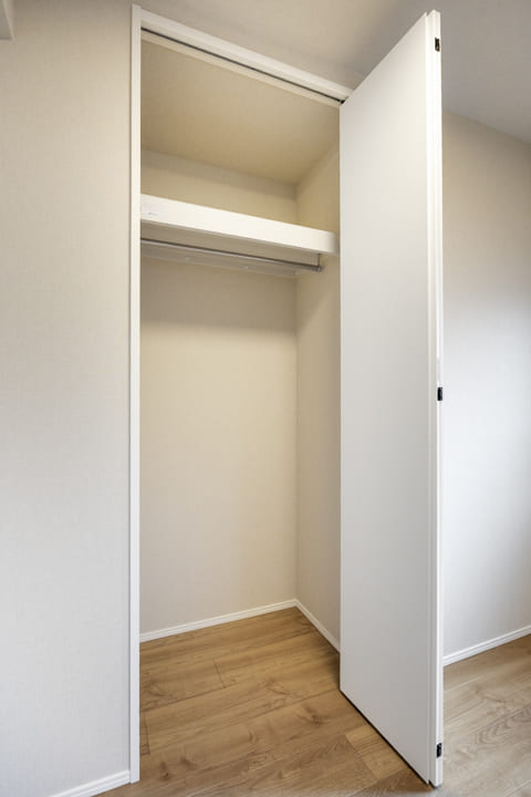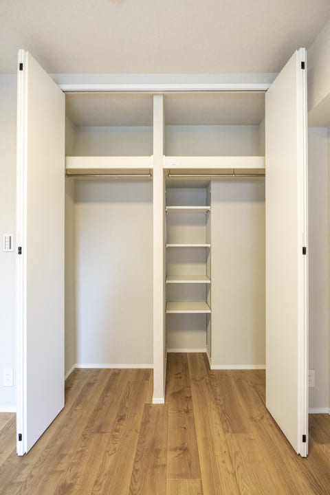 約5.6帖の主寝室は二面採光でゆとりのある空間です。窓からはバルコニーにアクセスができますよ。また、奥行きがあるクローゼットには、パイプハンガーや可動棚が設置されており、洋服も小物もきちんと収納することができます。