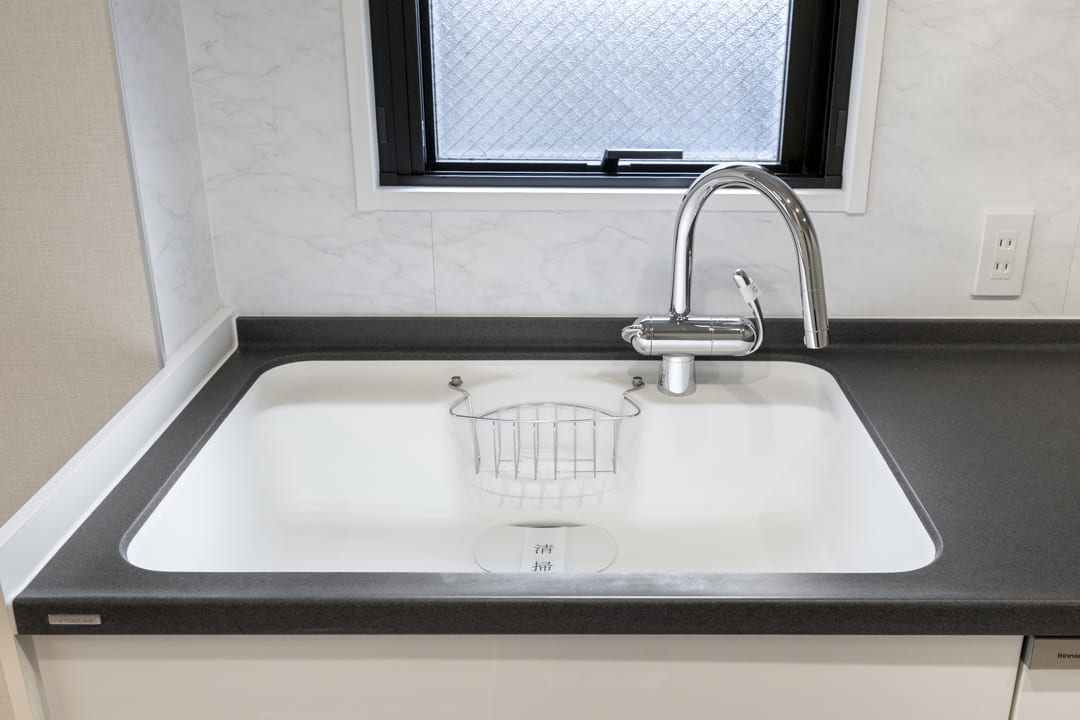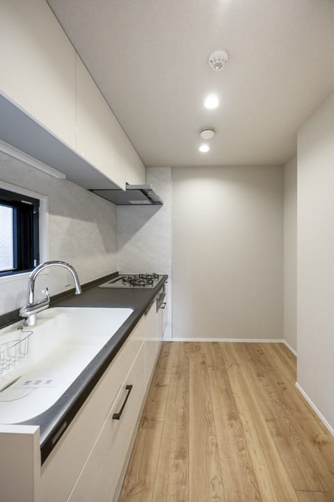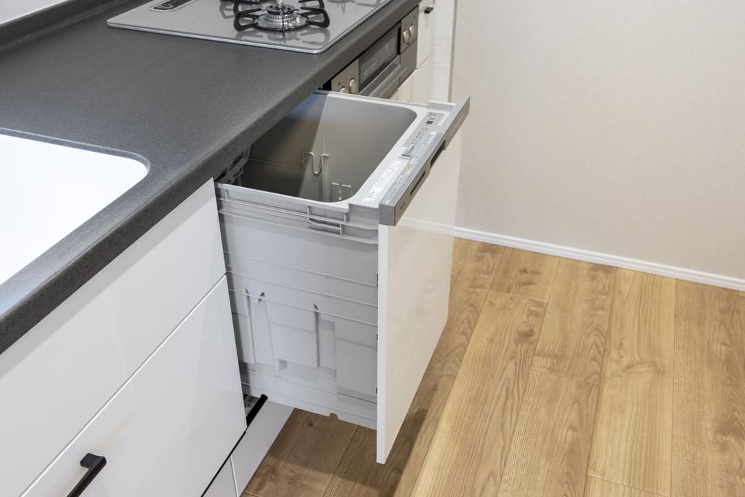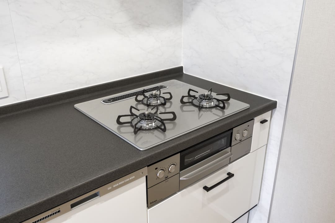 3口コンロ、グリル、食洗機付きで設備面が充実している壁付けキッチンです。南東向きに窓があるため、明るさもプラスしてくれます。また、作業スペースにはコンセントがあり、ミキサーなどのキッチン家電も使いやすくなっていますよ。