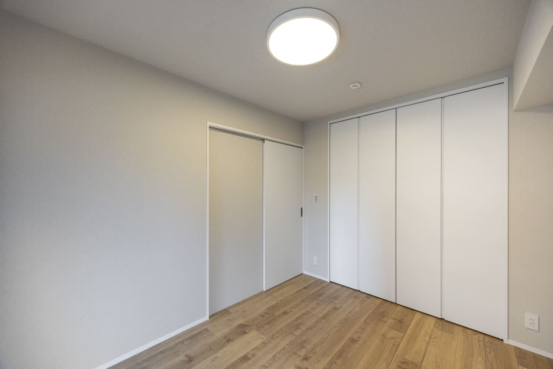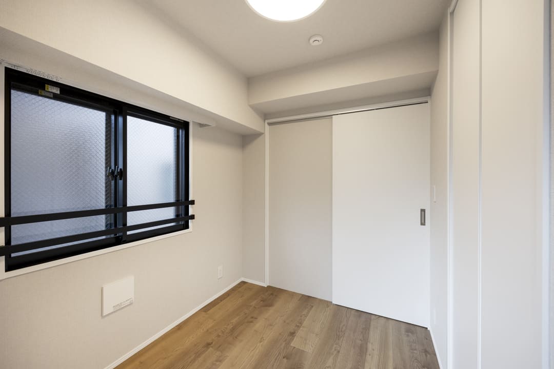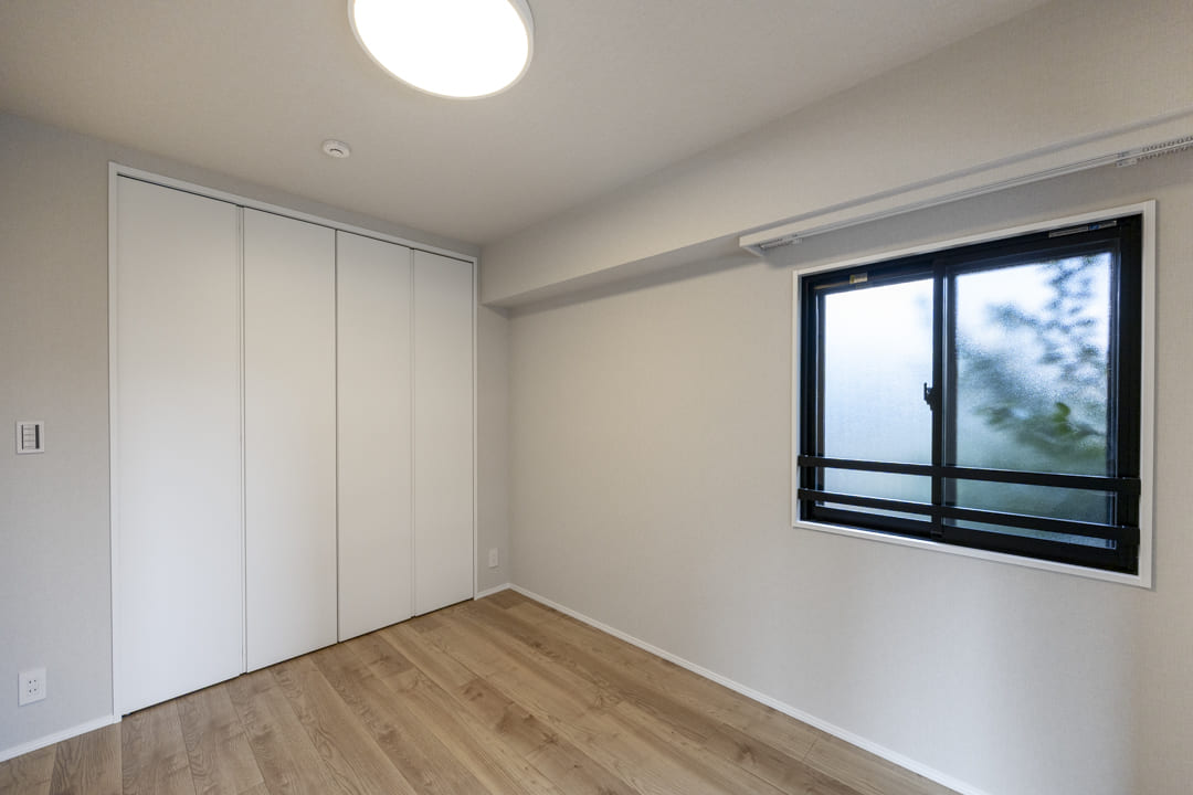 約4.0帖の洋室2は、一番コンパクトなお部屋ですが二面採光のため空間に広がりを感じます。風通しも良くて居心地◎。クローゼット付きのため収納スペースも確保されており、色々な使い方ができそうですよ。