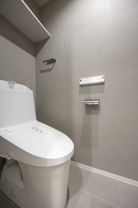 ウォシュレット一体型トイレです。上部には棚板が設置されているので、かごやボックスを置いて収納スペースとして利用ができます。
