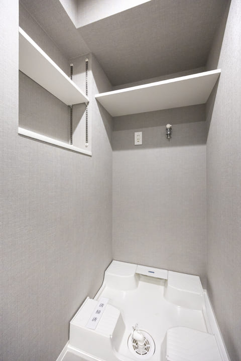 Panasonic製の洗面化粧台は、三面鏡の中に化粧品などを収納できて使い勝手が良好です。照明が縦に配置されているのも、顔に影をつくらなくて◎。また、洗面ボウルとカウンターに継ぎ目がないので、お手入れも簡単です。洗濯機置場には、可動棚や棚板が設置されており、洗剤やリネン類を置けそうですよ。