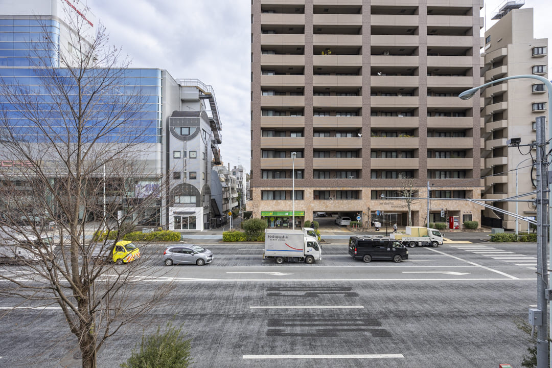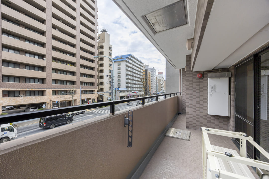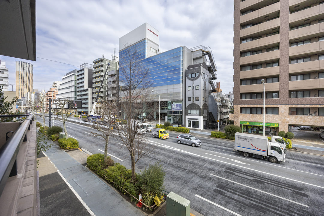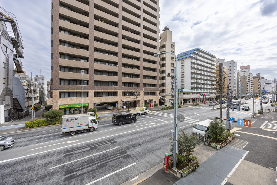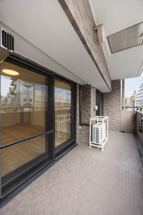 約10.44㎡のバルコニーはゆったりとした空間。チェアなどを置けば、ティータイムを楽しむこともできそうですよ。洗濯金物が設置されているので、洗濯物も干しやすくなっています。また、目の前は山手通りのため、建物が隣接しておらず、抜け感のある眺望です。