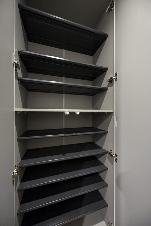 白を基調とした清潔感のある玄関です。シューズボックスは高さがありますが、フロートタイプのため空間に圧迫感を与えません。中には可動棚が設置されているので、持っている靴に合わせて調節することができますよ。