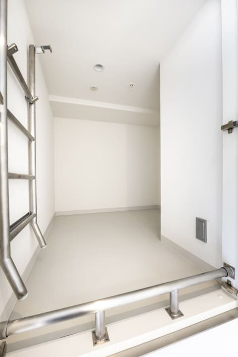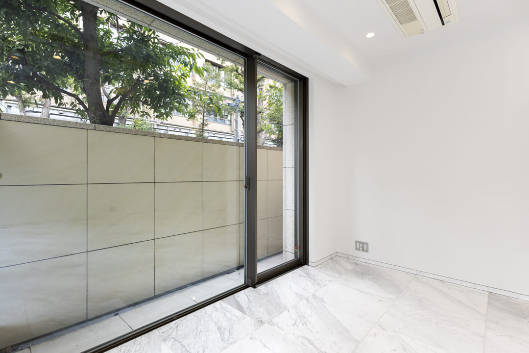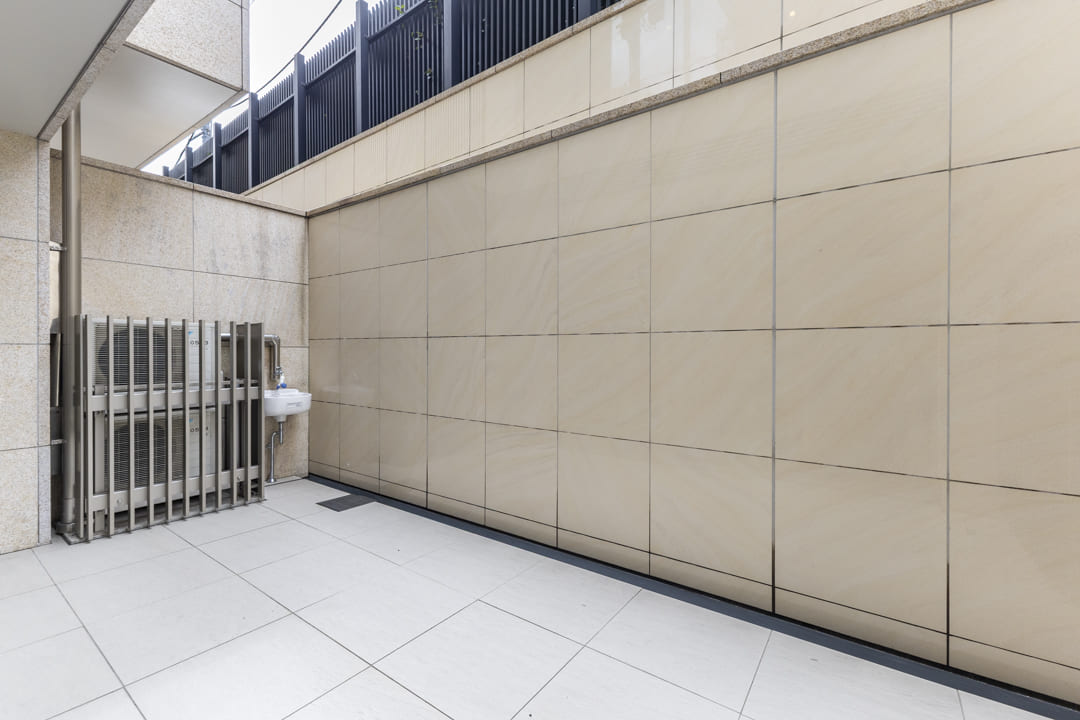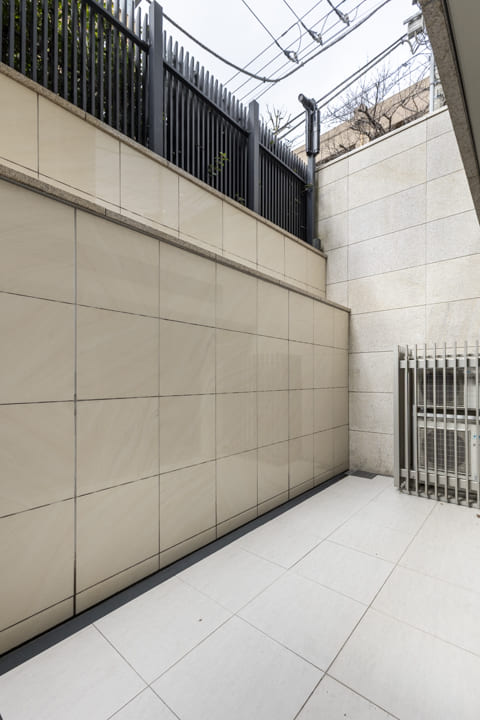 主寝室と寝室の2部屋に面した、16.55㎡のゆとりあるテラス。1階部分に位置し、プライベート性の高い屋外空間です。南西向きで、上部から自然光が差し込み、室内にも穏やかな明るさをもたらします。眺望はありませんが、その分落ち着いて過ごせる環境が整っています。靴やアウトドア用品のお手入れ、お花の水やりなどに便利なスロップシンクを備えています。